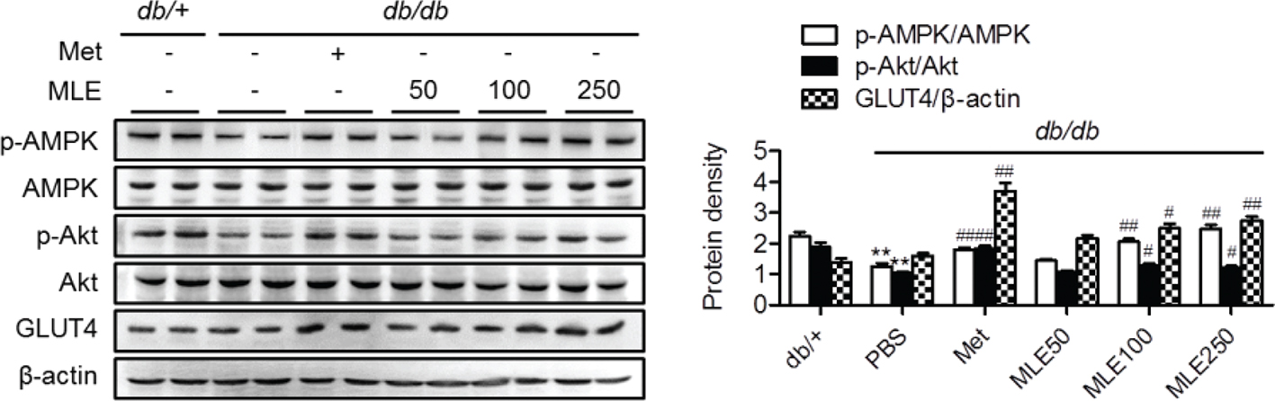 Fig. 6. Activation of PI3K/Akt signaling pathways by MLE in muscle. At the end of the study, the total and phosphorylated forms of Akt and AMPK, and GLUT4 were measured in skeletal muscle tissues. The band intensities of each form were quantitated. Values are expressed as mean±SEM (n = 7/each group). **p < 0.01 versus db/+ and #p < 0.05, ##p < 0.01 versus db/db+PBS.