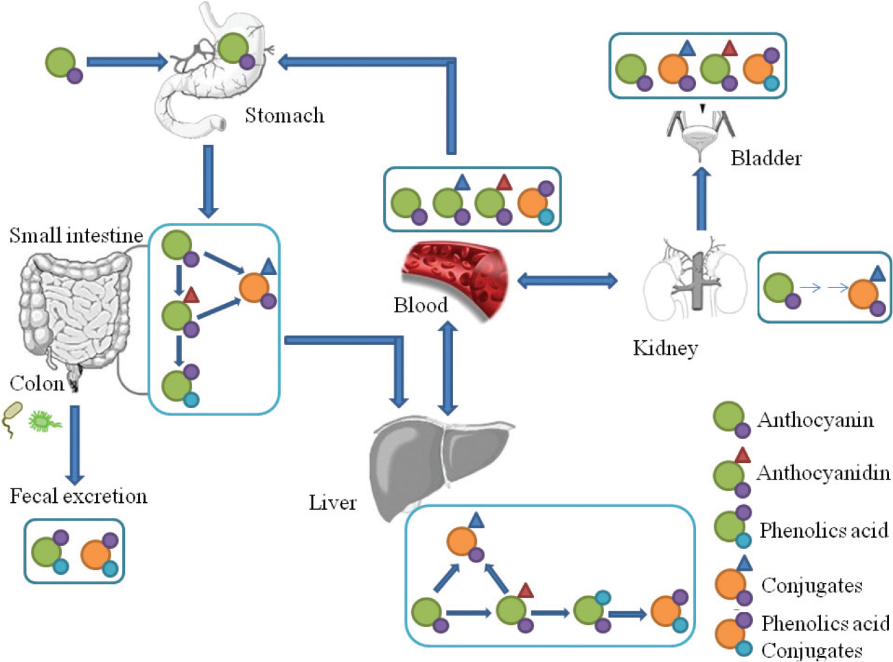Fig. 2. The hypothetic pathways of anthocyanin absorption and metabolism based on literature review (40, 41). Anthocyanin undergoes extensive metabolism in the body; the stomach exhibited only native anthocyanin, while in other organs native anthocyanin and its metabolites (phenolic acid or conjugates) were detected before being excreted.