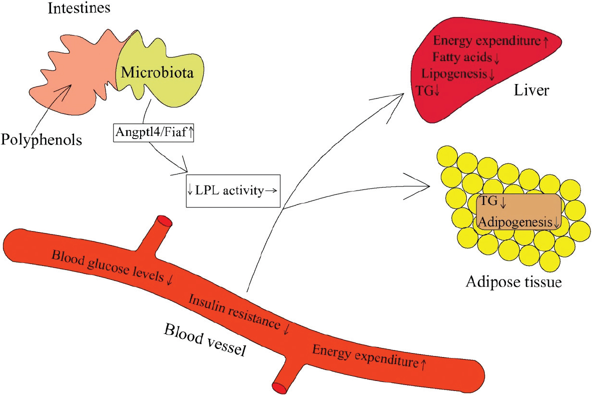 Fig. 4. Polyphenols change fiaf gene expression via reshaping microbiota structure (87, 88, 98–100). The active fiaf, an inhibitor of LPL, can promote lipid clearance in blood, suppress hepatic lipogenesis and contribute to the release of fatty acids and triacylglycerol from circulating lipoproteins in adipose tissue.