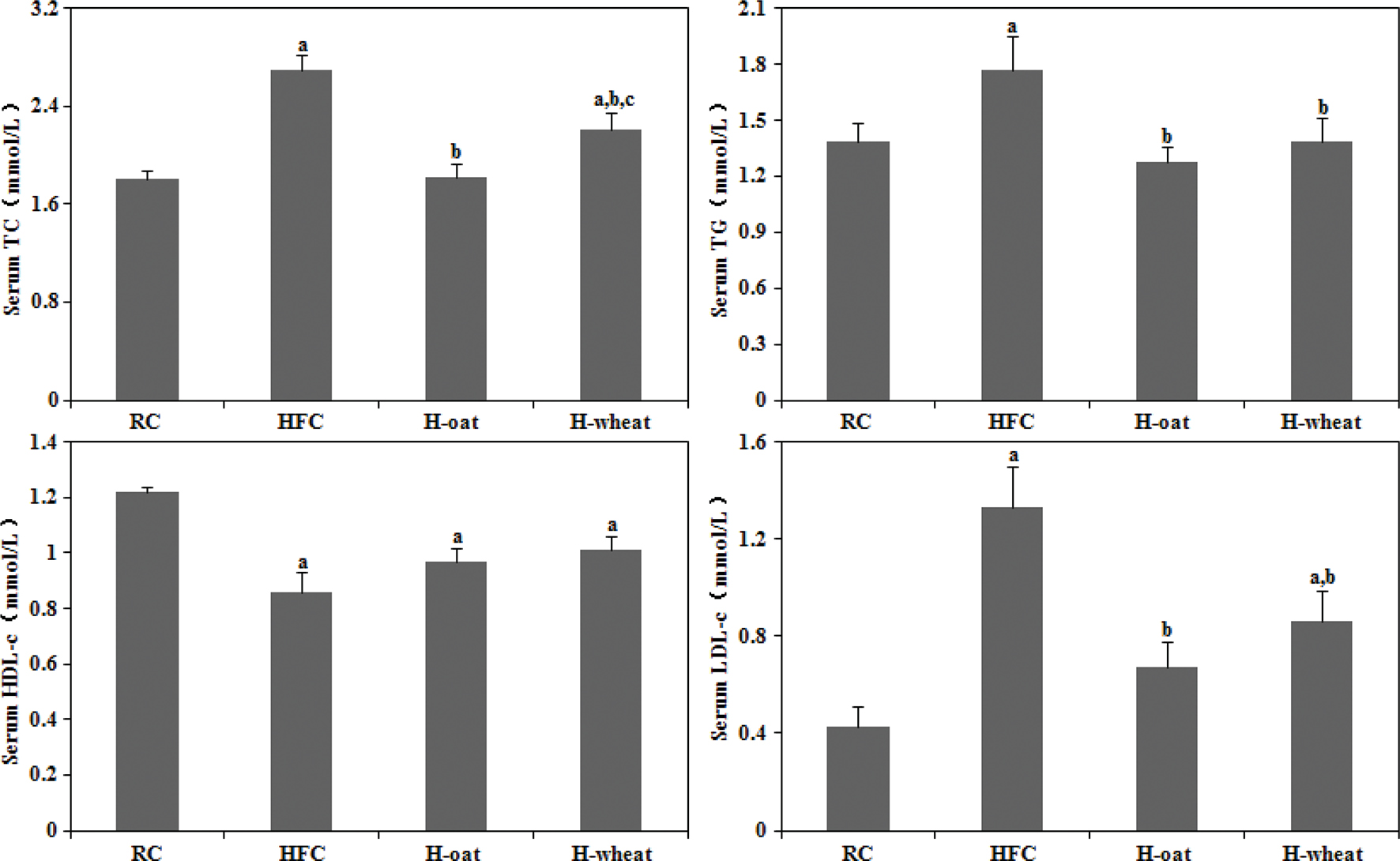 Fig. 1. Cereal fiber decreased serum TC, TG, and LDL-c levels without changing HDL-c levels in mice fed a HFC diet. Values are means ± SD (n = 10–12). aP < 0.05, versus mice fed with RC diet. bP < 0.05, versus mice fed with HFC diet. cP < 0.05, versus mice fed with H-oat diet. HFC, high-fat, high-cholesterol diet; H-oat, HFC diet plus 0.8% oat fiber; H-wheat, HFC diet plus 0.8% wheat bran fiber; HDL-c,high-density lipoprotein cholesterol; LDL-c, low-density lipoprotein cholesterol; RC, reference diet; TC, total cholesterol; TG, triglyceride.