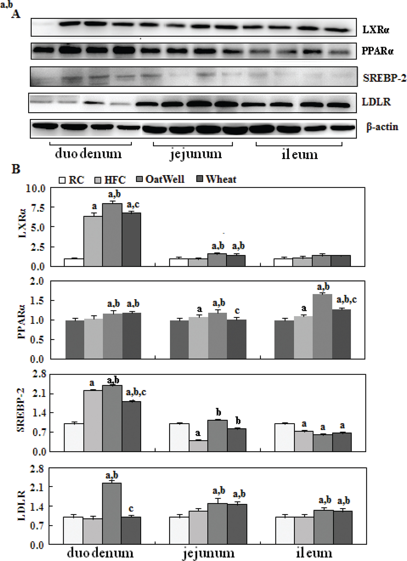 Fig. 2. Cereal fiber improved cholesterol metabolism by increasing PPARα, LXRα, SREBP-2, and LDLR expression in the small intestine tissues of mice fed a HFC diet. Values are means and SD (n = 6). aP < 0.05, versus mice fed with RC diet. bP < 0.05, versus mice fed with HFC diet. cP < 0.05, versus mice fed with H-oat diet. HFC, high-fat, high-cholesterol diet; H-oat, HFC diet plus 0.8% oat fiber; H-wheat, HFC diet plus 0.8% wheat bran fiber; LDLR, low-density lipoprotein receptor; LXRα, liver X receptor alpha; PPARα, peroxisome proliferator-activated receptor alpha; RC, reference diet group; SREBP-2, sterol regulatory element-binding protein 2.