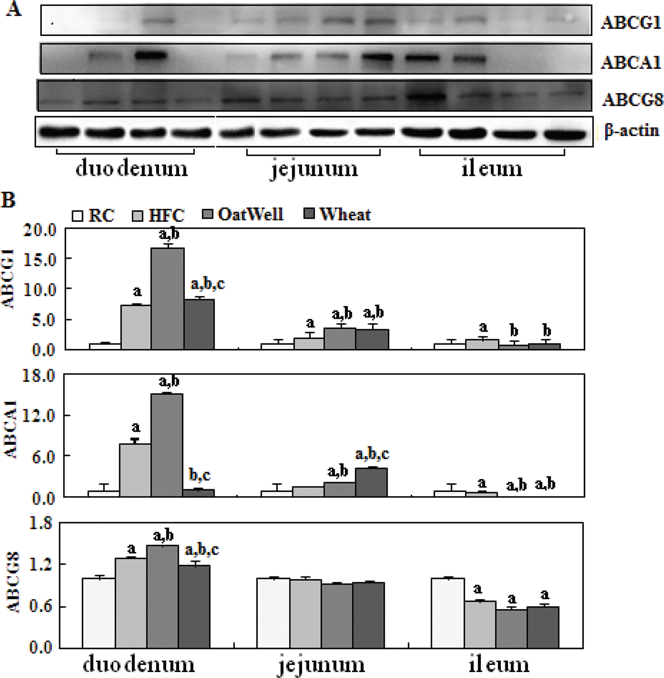 Figure 5 showed the role of cereal fiber on cholesterol efflux in the small intestine tissue. Compared with the HFC and RC groups, the H-oat group had increased protein expressions of ABCG1, ABCA1, and ABCG8 (P < 0.05), and this phenomenon mainly occurred in the duodenum, while the H-wheat group had slightly increased ABCG1 and ABCA1 protein levels in the jejunum (P < 0.05). In the ileum, the two cereal fibers had no effect on the transformed factors involved in cholesterol efflux.