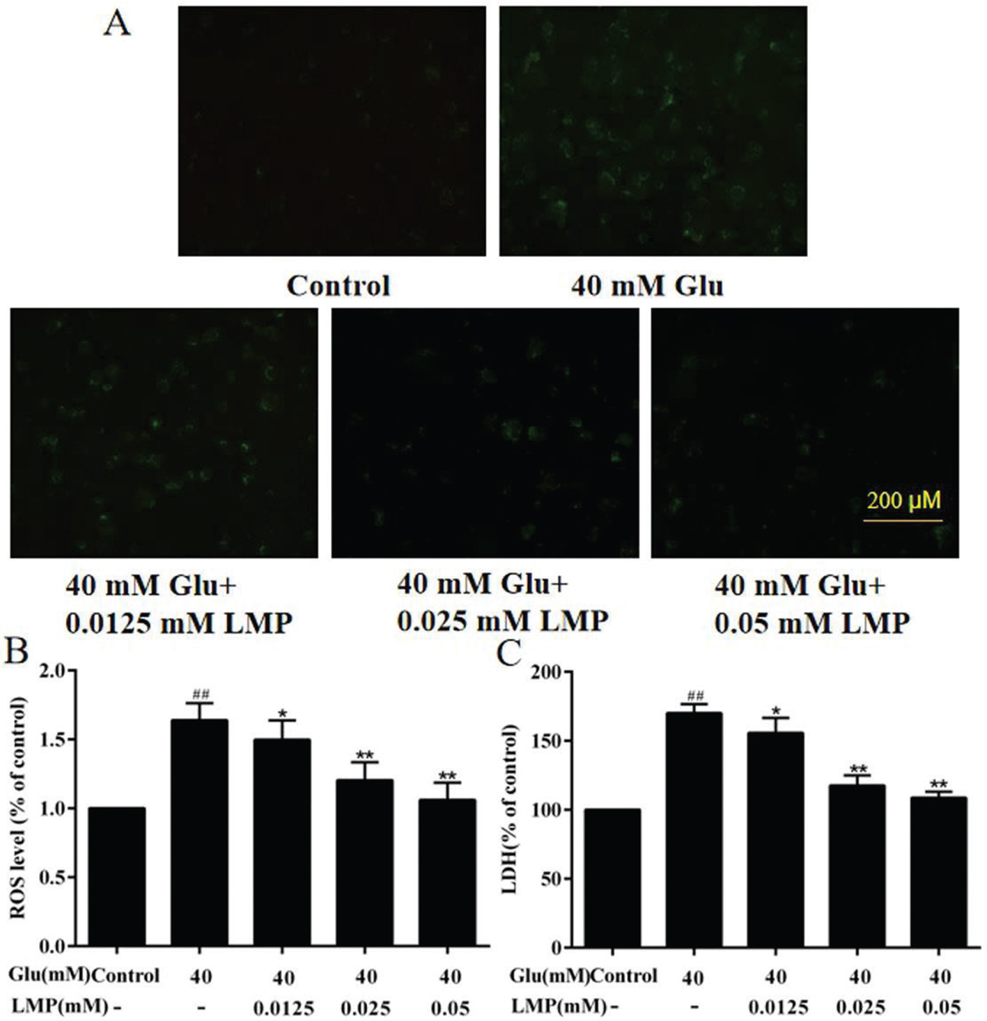 Fig. 3. Effects of LMP on ROS release and LDH overproduction in MIN6 cells after exposure to 40 mM glucose. (A) Results of MIN6 cells stained with DCFH-DA. (B) Quantitative analysis of ROS level in MIN6 cells. (C) The LDH release in MIN6 cells. Data are expressed as the mean ± standard deviation. ##P < 0.01 vs. control group, *P < 0.05, **P < 0.01 vs. group treated with glucose.