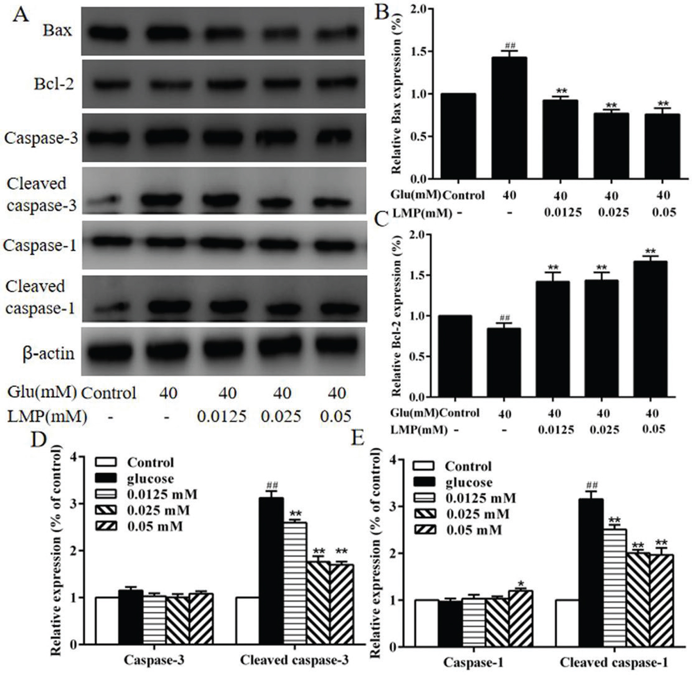 Fig. 5. The effects of LMP on the expression of apoptosis-related proteins in MIN6 cells (A) The expression levels of Bax, Bcl-2, Caspase-3, Cleaved caspase-3, Caspase-1 and Cleaved caspase-1 were detected by western blot assay. The levels of β-actin were used as an internal control. (B, C, D and E) Quantitative analysis of the protein expression of Bax, Bcl-2, Caspase-3, Cleaved caspase-3, Caspase-1, Cleaved caspase-1. Data are expressed as the mean ± standard deviation. ##P < 0.01 vs. control group, *P < 0.05, **P < 0.01 vs. group treated with glucose.