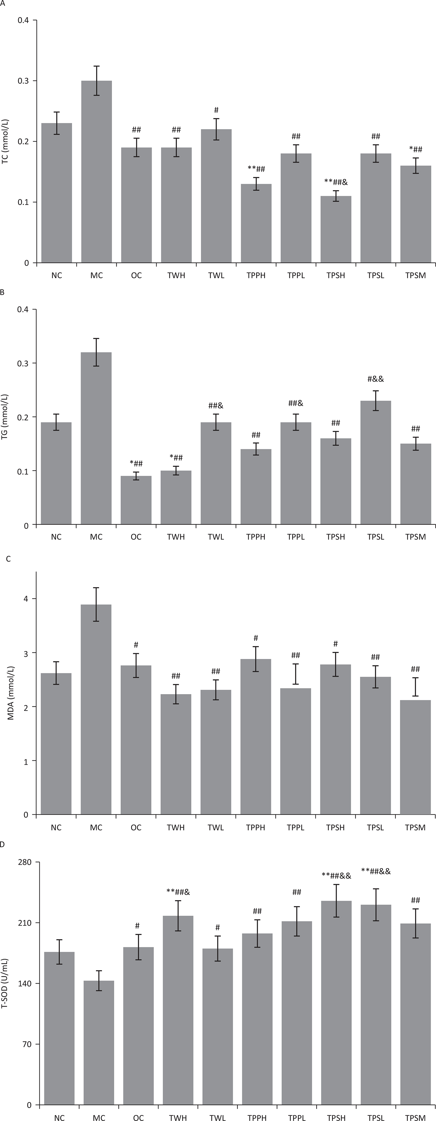 Hepatic lipid and antioxidant profiles are shown in Fig. 1 and Table 2. The triglyceride and cholesterol levels of rats in the MC group increased significantly compared with the NC group. Meanwhile, the serum triglyceride and cholesterol levels lowered significantly in the TWH, TPPH, TPPL, and TPSM groups. Moreover, the serum MDA and T-SOD levels reduced significantly in the TPSM, TWH, and TPPL groups; similar results were also observed in the hepatic MDA and T-SOD levels. However, the serum LDL-C levels in TWL, TPPH, TPPL, TPSH, TPSL, and TPSM groups were significantly lower than that of the MC group. TPSL and TPSM groups also exhibited significantly lower leptin levels than the other groups.