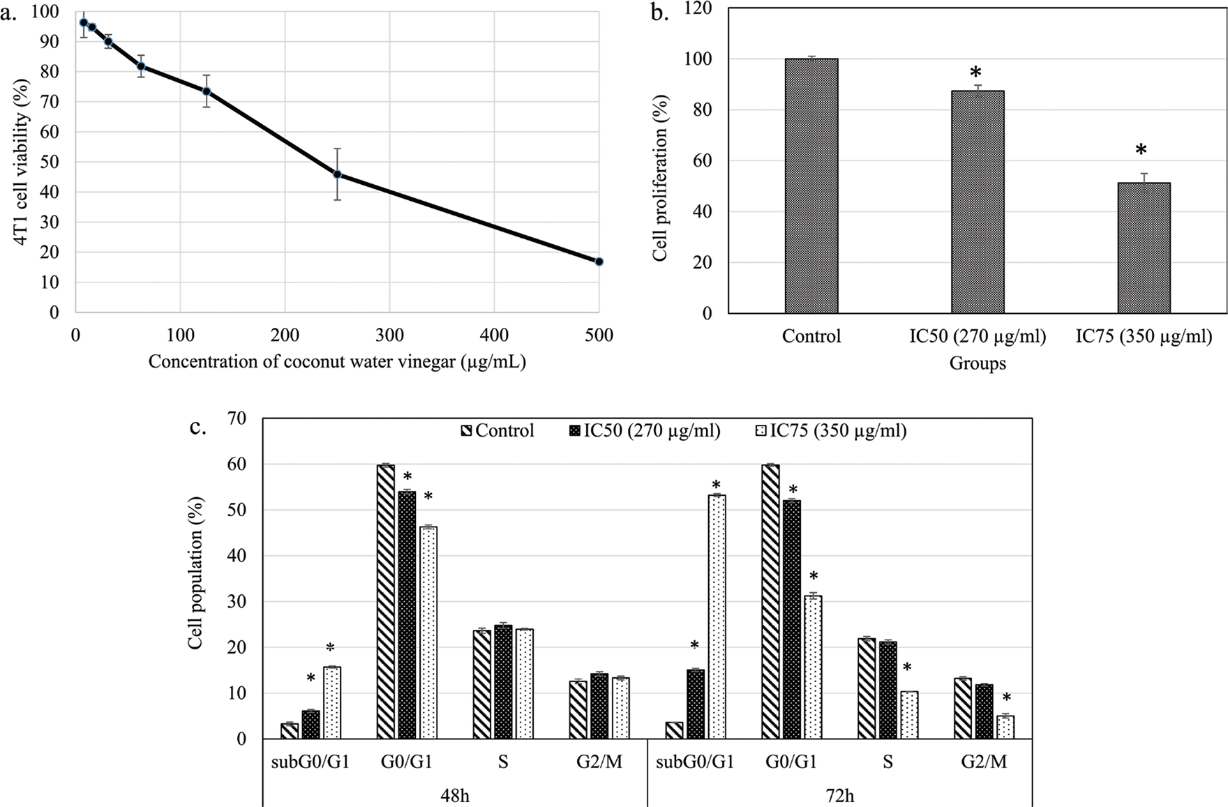 Fig. 1. (a) The percentage of 4T1 cell viability after treatment with freeze-dried coconut vinegar for 48 h. (b) The percentage of 4T1 cell proliferation quantified by BrdU ELISA test after treatment with freeze-dried coconut water vinegar (IC50 and IC75) for 72 h. (c) Cell cycle progression of untreated and freeze-dried coconut water vinegar (IC50 and IC75)-treated 4T1 cells at 48 and 72 h. Data are expressed as mean ± SEM. *p < 0.05.