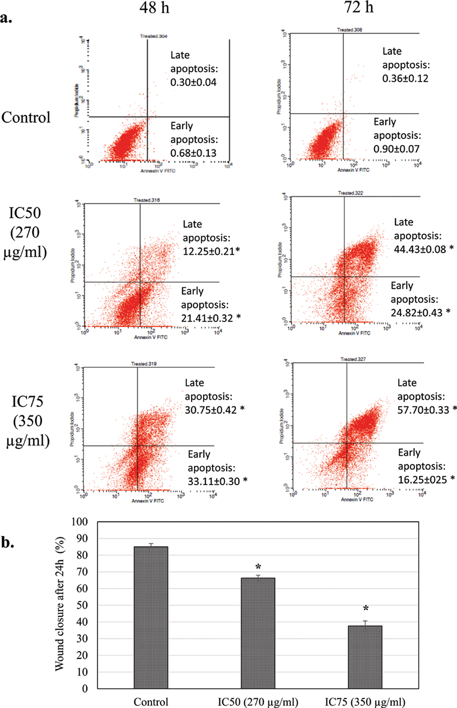 Fig. 2. (a) Annexin V/PI apoptosis quantification of untreated and freeze-dried coconut water vinegar-treated 4T1 cells at 48 and 72 h. (b) The percentage of untreated and IC25 coconut water vinegar-treated 4T1 cell wound closure in the scratch test after incubation for 24 h. Data are expressed as mean ± SEM. *p < 0.05.