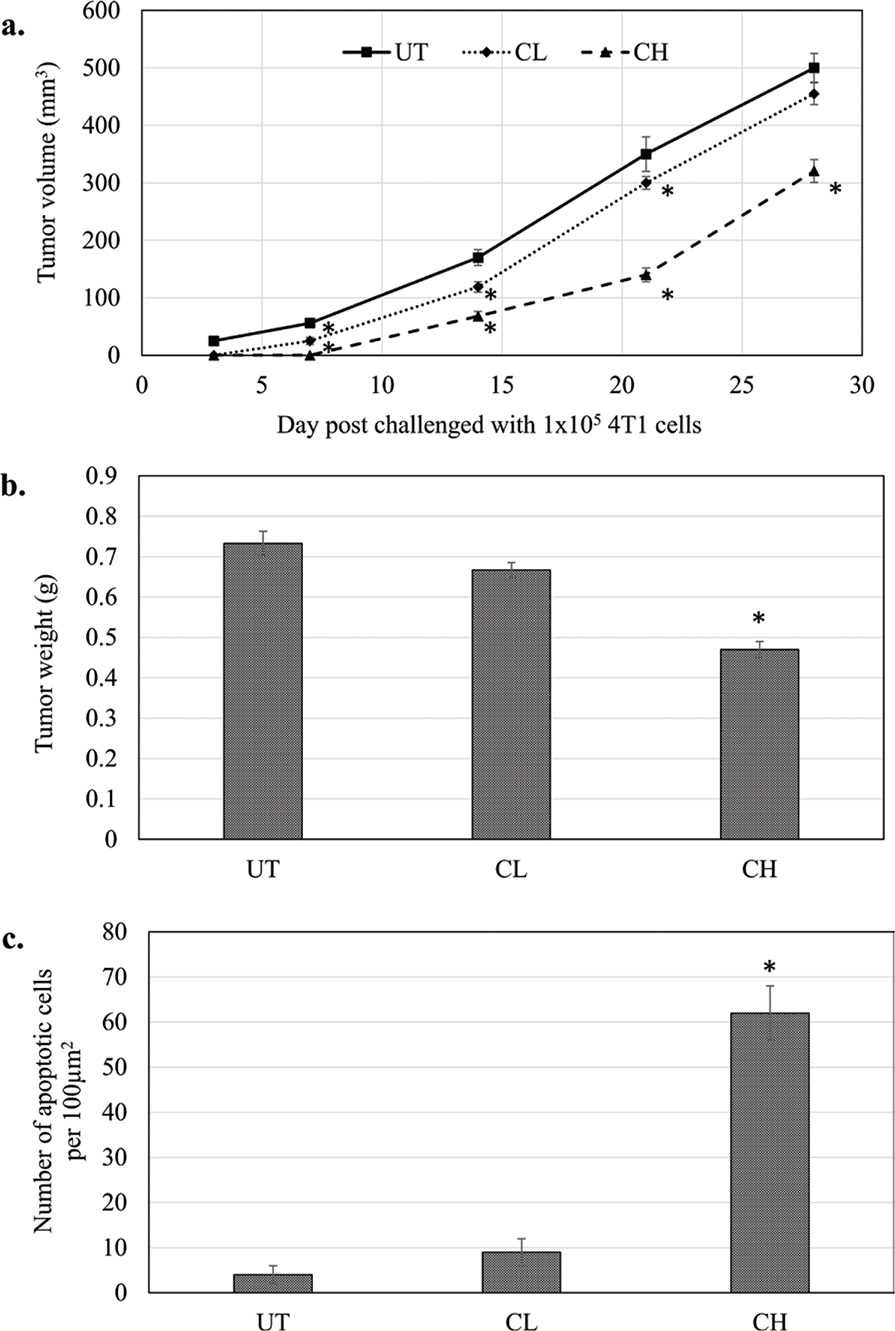 Fig. 3. (a) Tumour volume (mm3) (from day 0 to 28 post-challenge) and (b) tumour weight at day 28 post-challenge of untreated, 0.08 (CL) and 2 (CH) mL/kg body weight coconut water vinegar-treated 4T1-challenged mice. (c) TUNEL assay quantification of the apoptotic event in the tumours of untreated, 0.08 (CL) and 2 (CH) mL/kg body weight coconut water vinegar-treated 4T1-challenged mice. Data are expressed as mean ± SEM. *p < 0.05.