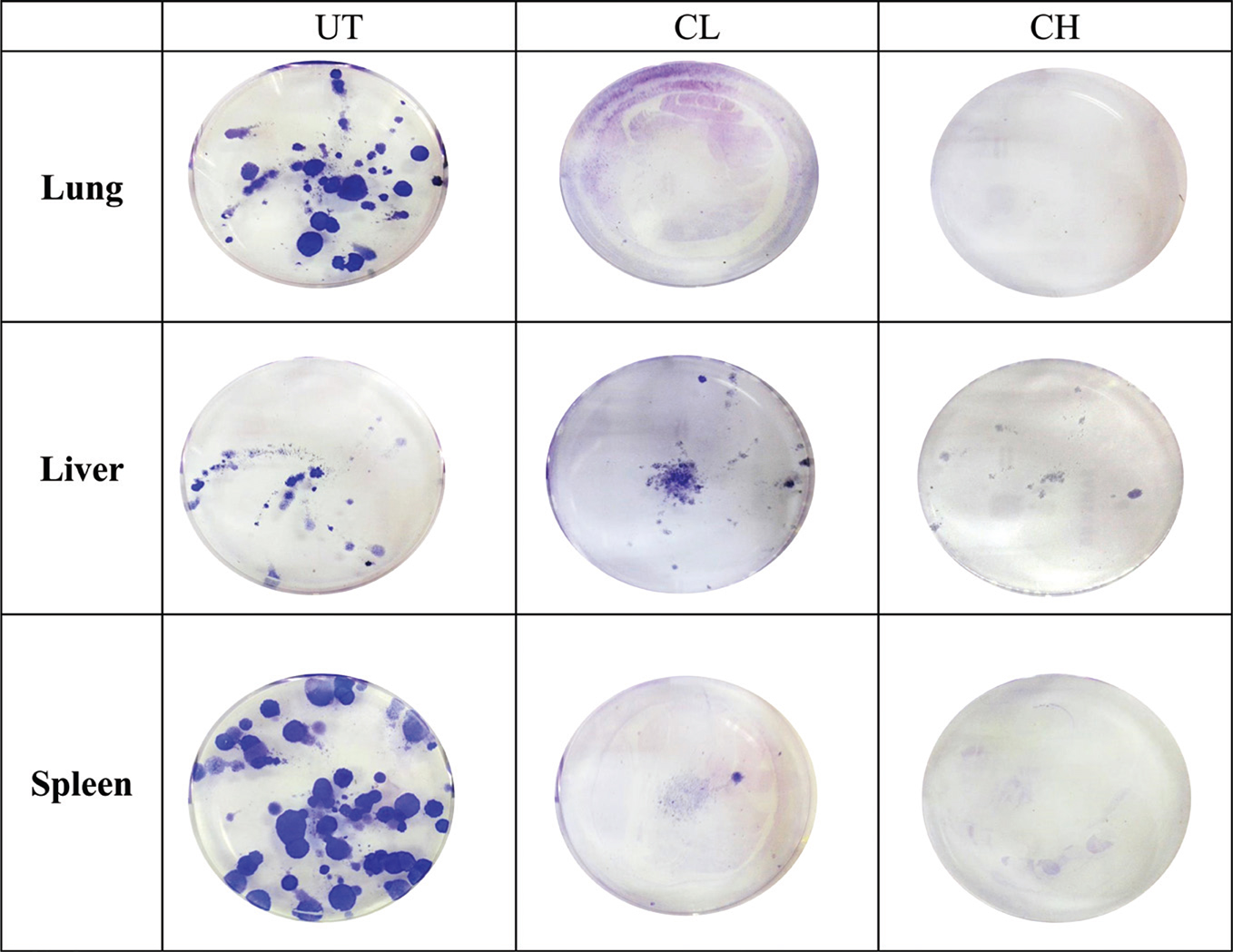 Fig. 4. Representative image of the 4T1 colonies formed in the lungs, liver and spleen of untreated, 0.08 (CL) and 2 (CH) mL/kg body weight coconut water vinegar-treated 4T1-challenged mice.