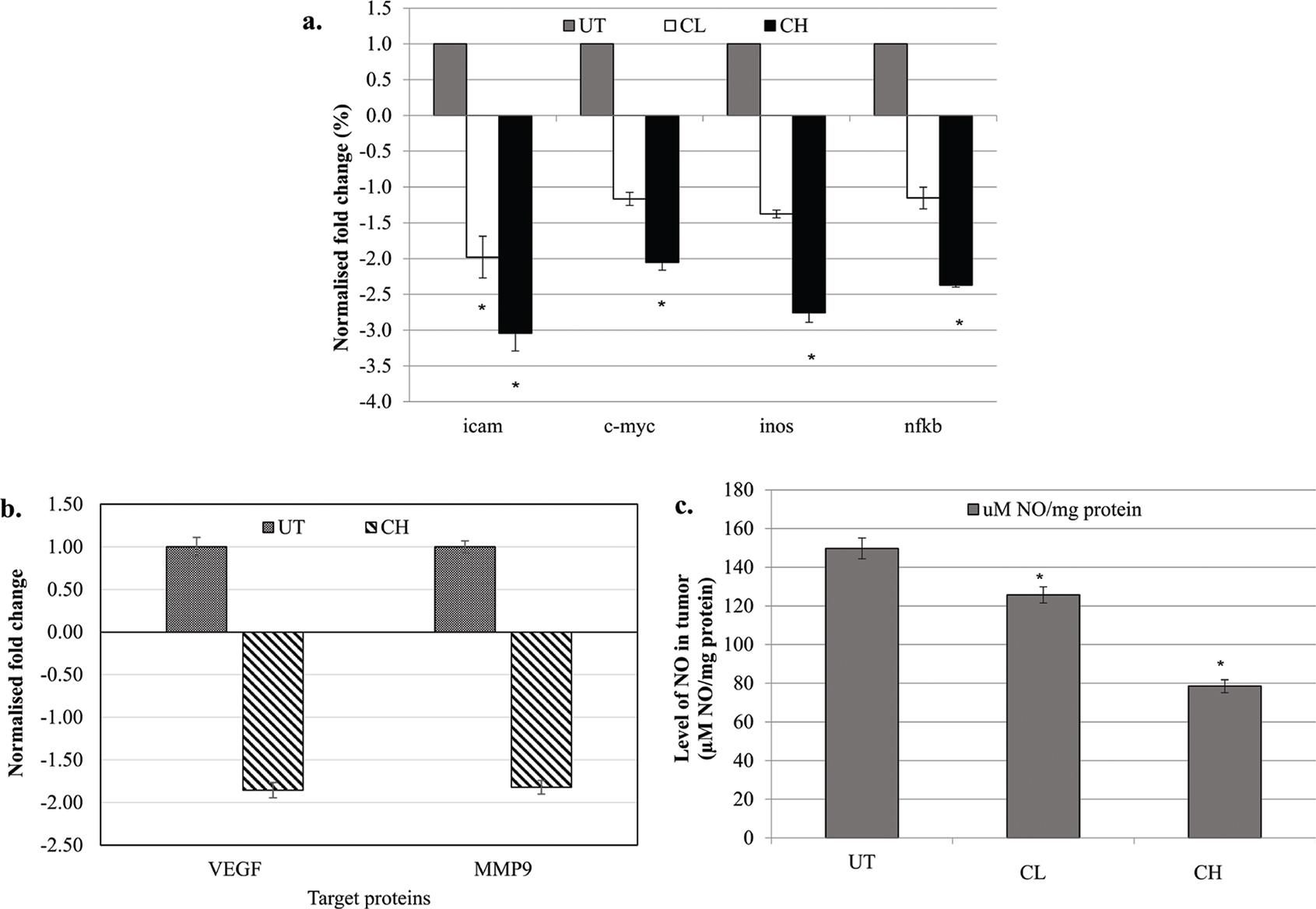 Fig. 5. (a) Differential expression of iCAM, c-myc, iNOS and NF-κB genes in the tumour of untreated, 0.08 (CL) and 2 (CH) mL/kg body weight coconut water vinegar-treated 4T1-challenged mice quantified by qRT-PCR. Expression was normalised to GAPDH, HRPT and β-actin. (b) Differential expression of MMP9 and VEGF proteins in the tumour of untreated and 2 (CH) mL/kg body weight coconut water vinegar-treated 4T1-challenged mice quantified by western blot analysis. Expression was normalised to β-actin. (c) Nitric oxide (NO) level in the tumour of untreated, 0.08 (CL) and 2 (CH) mL/kg body weight coconut water vinegar-treated 4T1-challenged mice quantified by the Griess assay. Data are expressed as mean ± SEM. *p < 0.05.