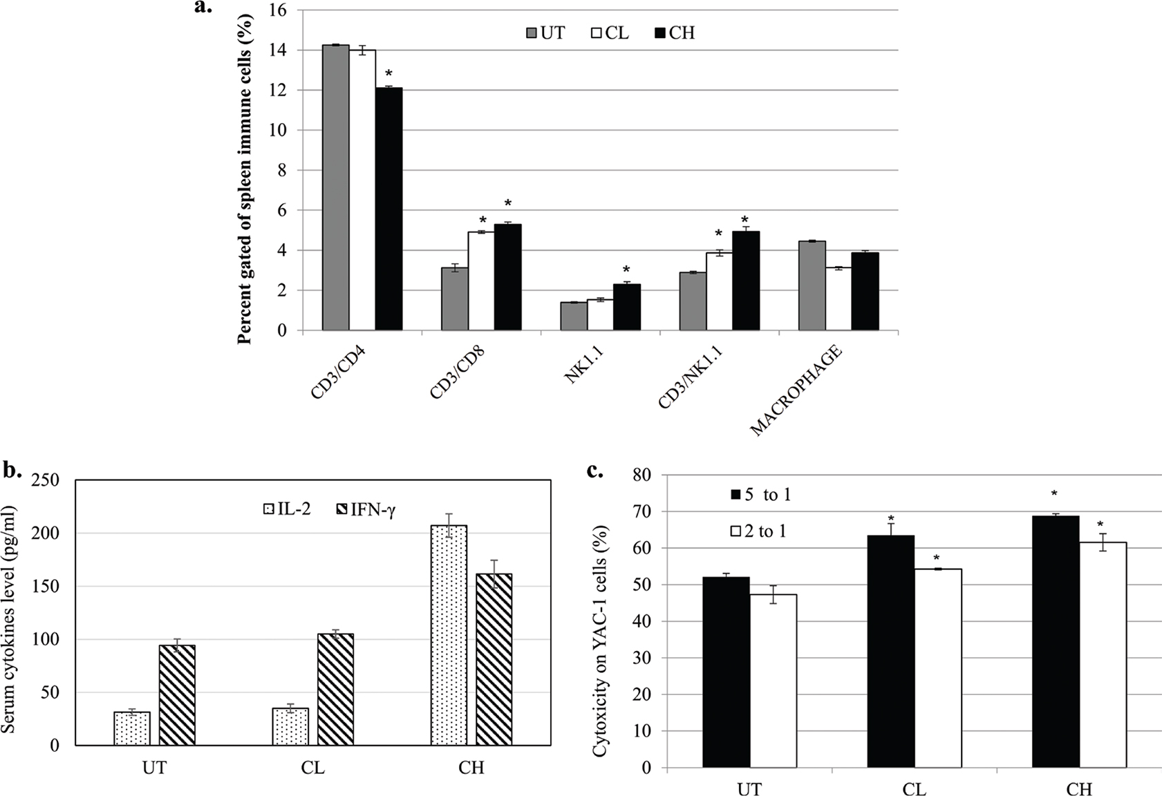Fig. 6. (a) Population of CD3+CD4+, CD3+CD8+, NK1.1 and macrophages in the spleen of untreated, 0.08 (CL) and 2 (CH) mL/kg body weight coconut water vinegar-treated 4T1-challenged mice quantified by flow cytometer immunophenotyping. (b) IL-2 and IFNγ levels in the serum of untreated, 0.08 (CL) and 2 (CH) mL/kg body weight coconut water vinegar-treated 4T1-challenged mice quantified by ELISA. (c) Co-cultivation of splenocytes from untreated, 0.08 (CL) and 2 (CH) mL/kg body weight coconut water vinegar-treated 4T1-challenged mice with YAC-1 cells at 5:1 and 2:1 ratios. Cytotoxicity was quantified by the Cytotox 96 non-radioactive LDH assay. Data are expressed as mean ± SEM. *p < 0.05.
