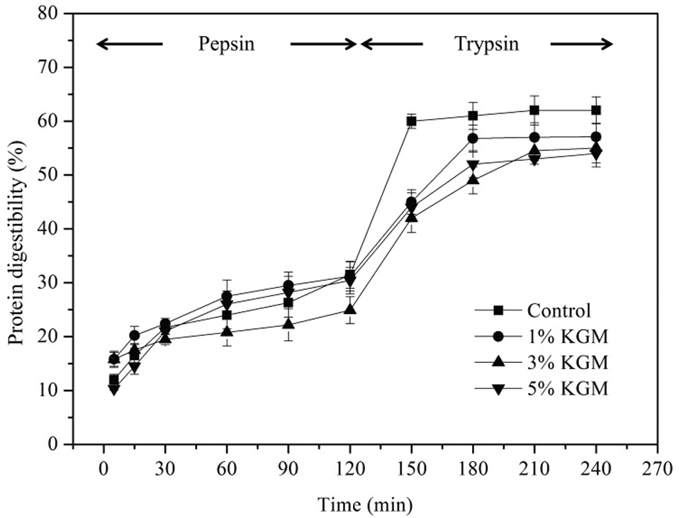 The digestibility of wheat gluten with different contents of KGM was shown in Fig. 2. The rate of digestion was attenuated with time due to the decrease of substrates. Wheat gluten was hydrolyzed by pepsin at pH of 1.4 to simulate the digestion of protein in stomach and trypsin at pH 6.8 to simulate the digestion of protein in small intestine, of which the enzymolysis time is 120 min for each period.