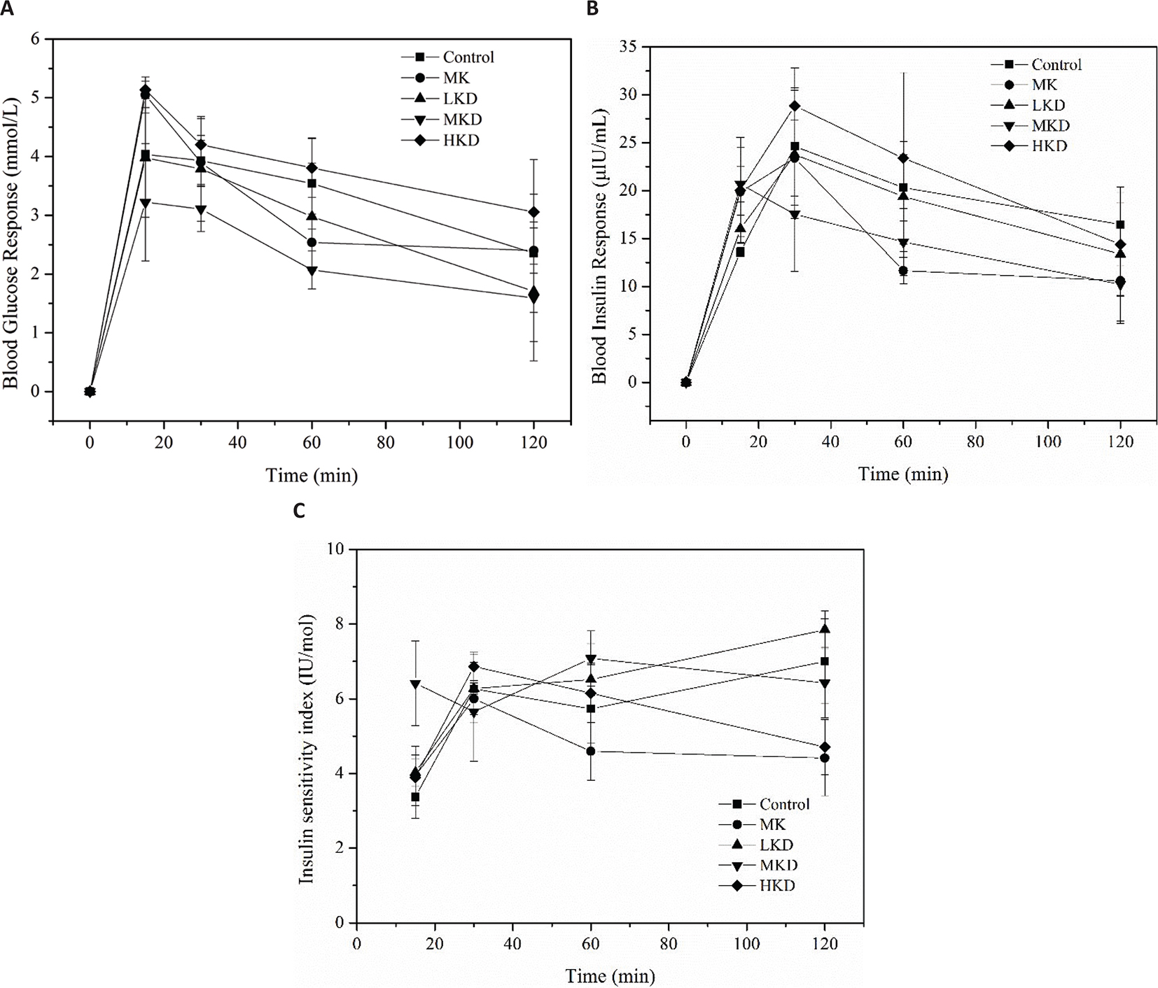 The sensitivity of the body to insulin is another important factor in stabilizing postprandial blood glucose. Figure 3c showed the insulin sensitivity (IS) index varying with time for different groups. After 15 min of feeding, the IS index of MKD peaked for the first time before the other groups which can be explained that the rapid growth of insulin is caused by the MKD group in Fig. 3b. The IS index of KD group was higher than that of the control group before 60 min, indicating that the KD group had increased the IS index to some extent, which was in accordance with previous studies (29). The IS index followed the order: LKD > Control > MKD > HKD > MK, when it is 2 h after feeding.