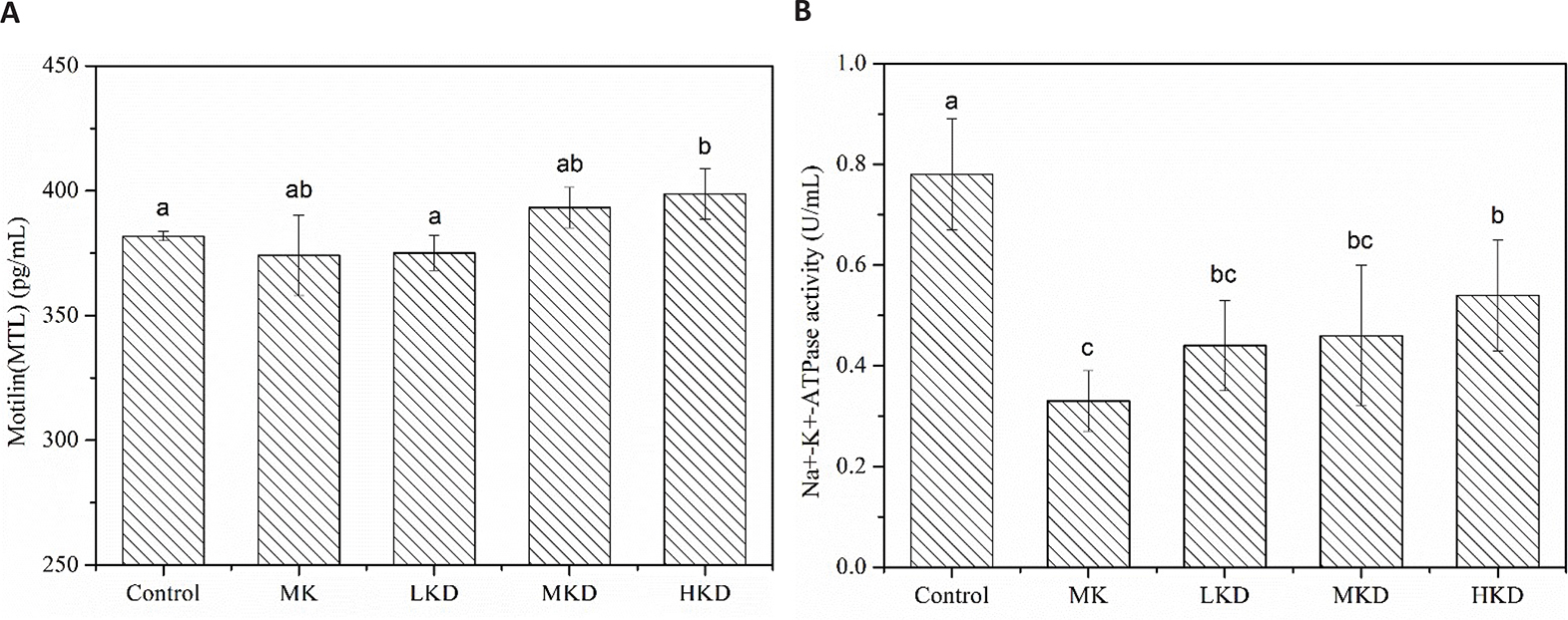 Fig. 4. Concentration of plasma motilin (a) and the activity of serum Na+-K+-ATPase (b) of mice after intragastric administration. The samples of motilin and Na+-K+-ATPase were taken from the plasma of rats sacrificed at 30 and 60 min after gavage, respectively. Data are representative of data obtained from four animals randomly selected from each group. LKD: precooked noodles based 2 wt% KGM, MKD: precooked noodles based 4 wt% KGM, HKD: precooked noodles based 8 wt% KGM, and MK: 4 wt% KGM mixed directly with precooked noodles. Values are means ± SD. Different letters superscripted on the columns indicate significant difference, P < 0.05.
