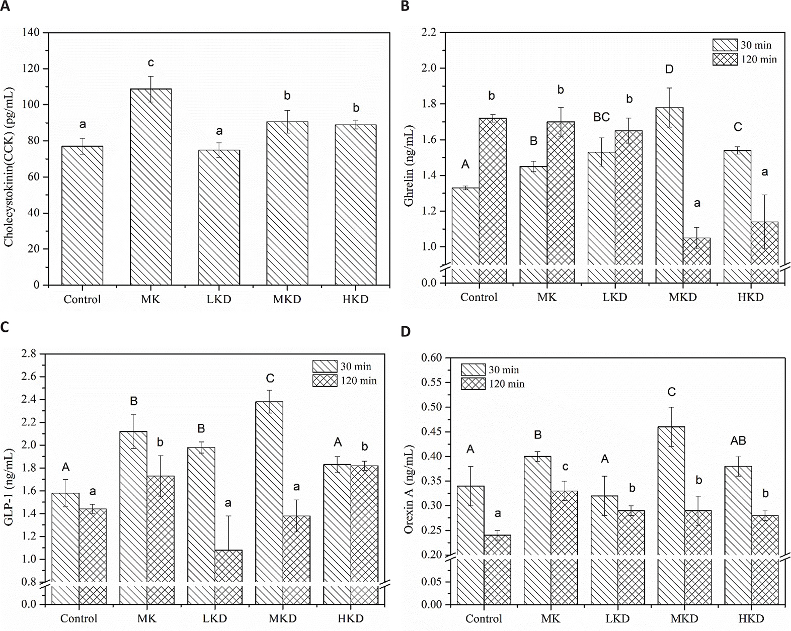 Fig. 5. Effect of different noodles-based KGM on gastrointestinal hormones: (a) Concentration of in plasma cholecystokin, (b) plasma ghrelin, (c) plasma GLP-1, and (d) plasma orexin of mice after intragastric administration. Different striped columns represent plasma gastrointestinal hormone levels at 30 and 120 min, respectively. Data are representative of data obtained from four animals randomly selected from each group. LKD: precooked noodles based 2 wt% KGM, MKD: precooked noodles based 4 wt% KGM, HKD: precooked noodles based 8 wt% KGM, and MK: 4 wt% KGM mixed directly with precooked noodles. Values are means ± SD. Different uppercase and lowercase letters superscripted on the columns indicate significant difference, P < 0.05.
