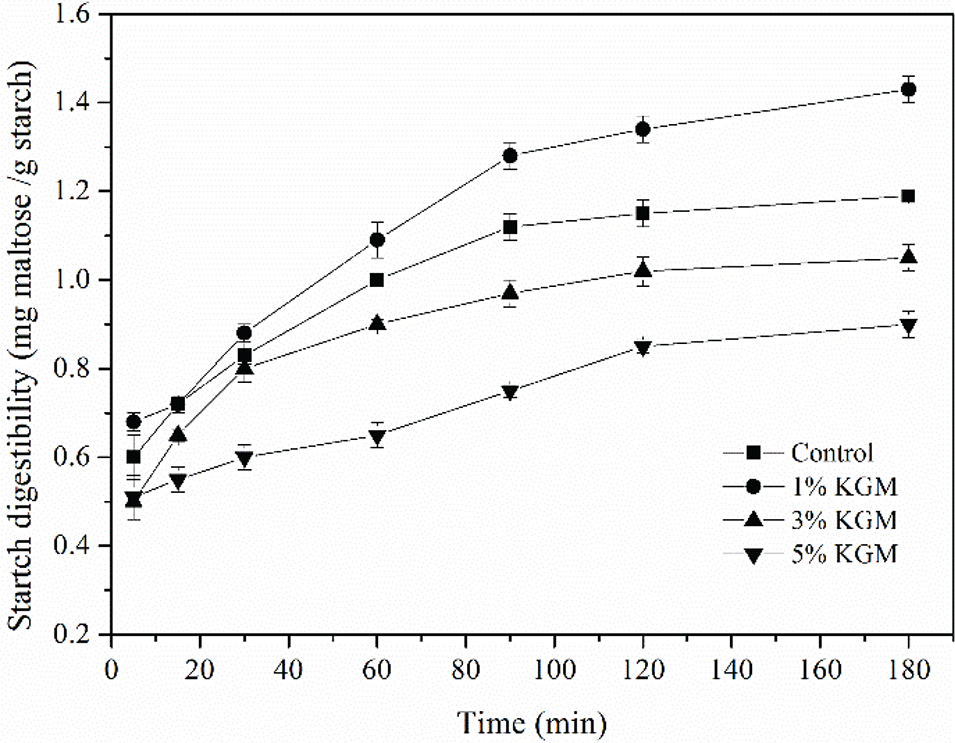 The digestibility of wheat starch with different contents of KGM was depicted in Fig. 1. The digestion was initially fast from 5 to 90 min. After 90 min of rapid digestion, the rates were alleviated. As shown in Fig. 1, the rate of digestion of gelatinized starch significantly decreased with 3% KGM and 5% KGM. Nevertheless, the in vitro digestibility of 1% KGM was significantly higher than those of the other samples. The differences in the inhibitory capacity on starch digestibility proved that the concentration of KGM is important for enzymatic hydrolysis, which could be explained in two aspects: firstly, in such a heterogeneous system, KGM molecules tended to be attached to the surface of starch particles, forming a barrier-like layer on the periphery, which blocked the contacts between enzymes and starch, especially the binding sites of enzymes and starch molecules. Besides, as the proportion of KGM increases, the thickening effects of KGM might limit mass transfer and further inhibit starch swelling (22–25); secondly, the thickening effects of KGM could also lower the rate of starch retrogradation by inhibiting the rearrangement of the leaching starch molecules to form the semi-crystal structure (26). Therefore, when the steric hindrance of enzyme–starch binding is dominant, a lower hydrolysis rate could be expected, which is the case of 3 and 5% KGM groups. Otherwise, KGM could even make it easier for amylase to hydrolyze the amorphous region of starch and eventually achieve an even higher starch digestibility at such a low concentration of 1% KGM.