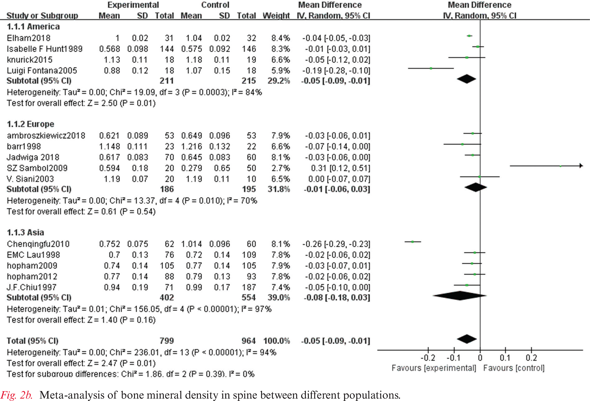 Fig. 2b. Meta-analysis of bone mineral density in spine between different populations.