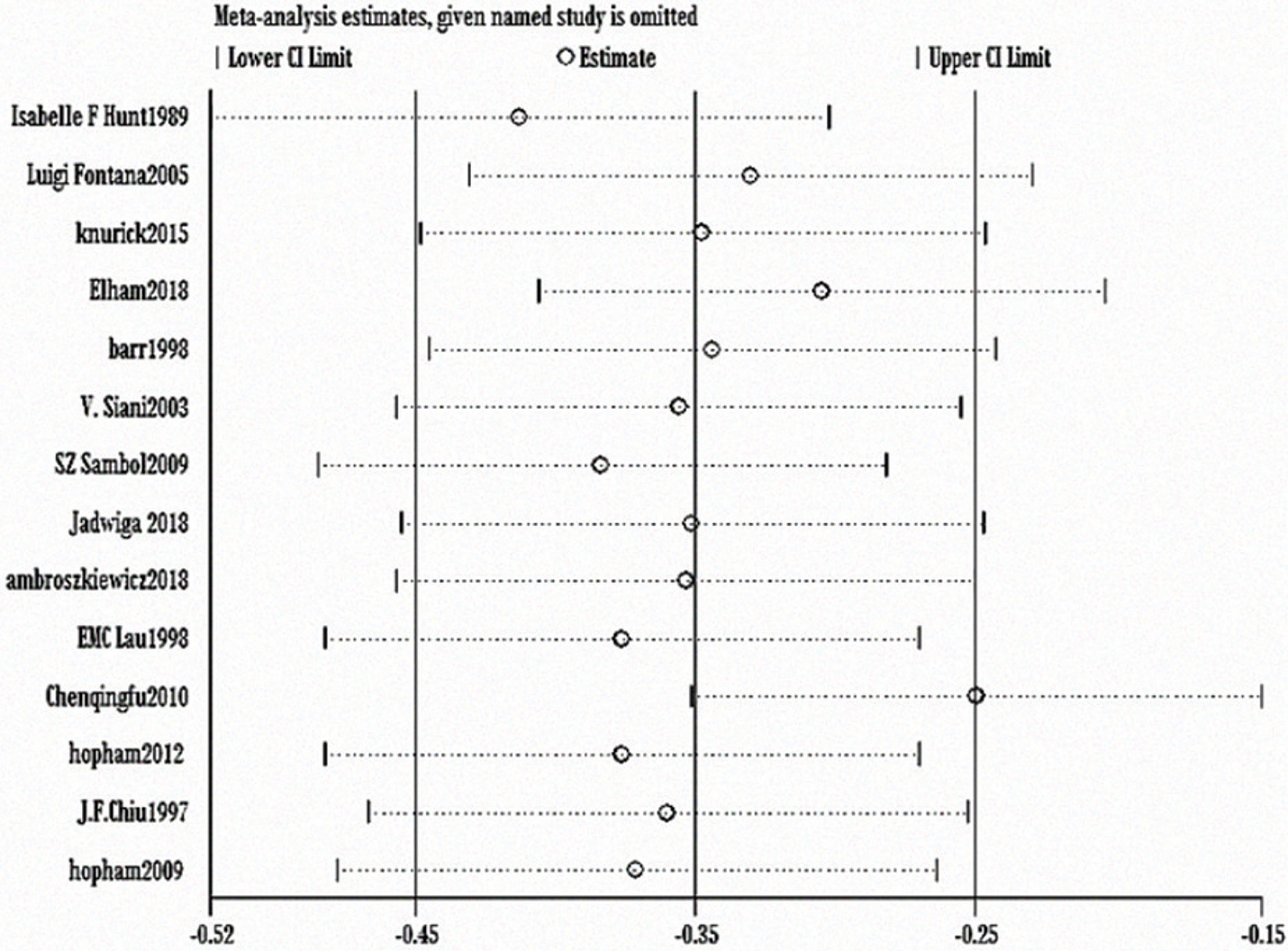 - Sensitivity analysis revealed that the Chen study (16) had a greater impact on the stability of the conclusion (Fig. 2c). After removing the Chen study (16), the lumbar vertebral density of the non-vegetarian group was higher than the vegetarian group (mean difference: -0.03, 95% CI: -0.05 to -0.01, P = 0.0006). Heterogeneity analysis was carried out by removing small sample size, which influenced sensitivity. After removing Chen (16), Fontana (13), Knurick (18), Barr (11), Siani (12), and Sambol (15) studies, the heterogeneity was low (χ2 = 8.84, P = 0.26, I2 = 21%), and the lumbar vertebral density of the non-vegetarian group was higher than the vegetarian group (mean difference: -0.03, 95% CI:, P < 0.00001).