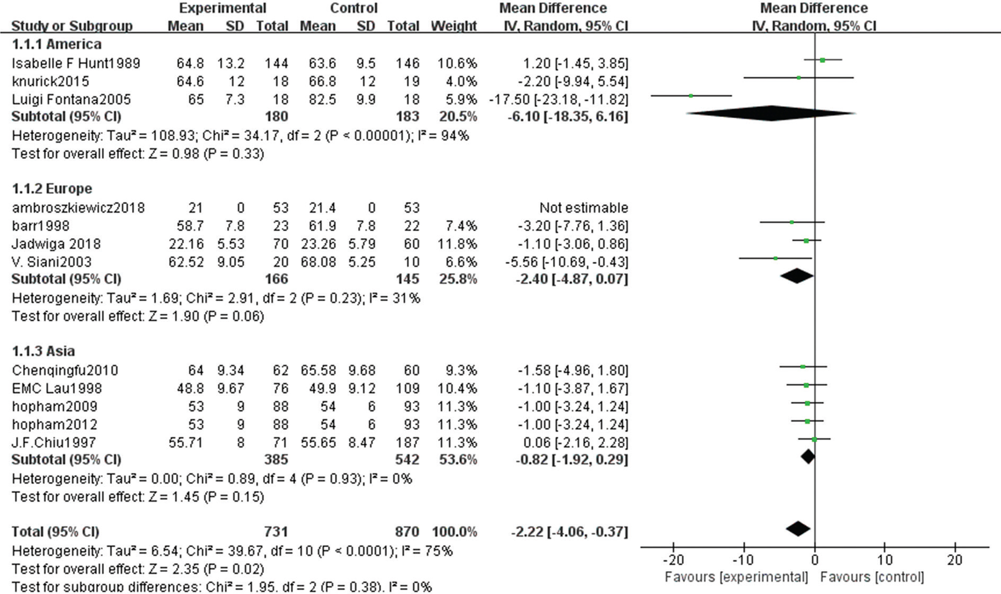 - According to subgroup analysis, 1) based on a comparison of the age group, the height of the non-vegetarian group at 50 years of age was greater than that of the vegetarian group (mean difference: -2.01, 95% CI: -2.72 to -1.31, P < 0.00001; subgroup difference: χ2 = 2.09, P = 0.35, I2 = 4.2%; Fig. 5a), and 2) based on regional comparison, the height of the non-vegetarian group was greater than that of the vegetarian group (mean difference: -1.70, 95% CI: -3.22 to -0.18, P = 0.03) in the American or Asian population (mean difference: -1.95, 95% CI: -2.71 to -1.19, P < 0.00001; subgroup difference: χ2 = 0.17, P = 0.92, I2 = 0%; Fig. 5b).