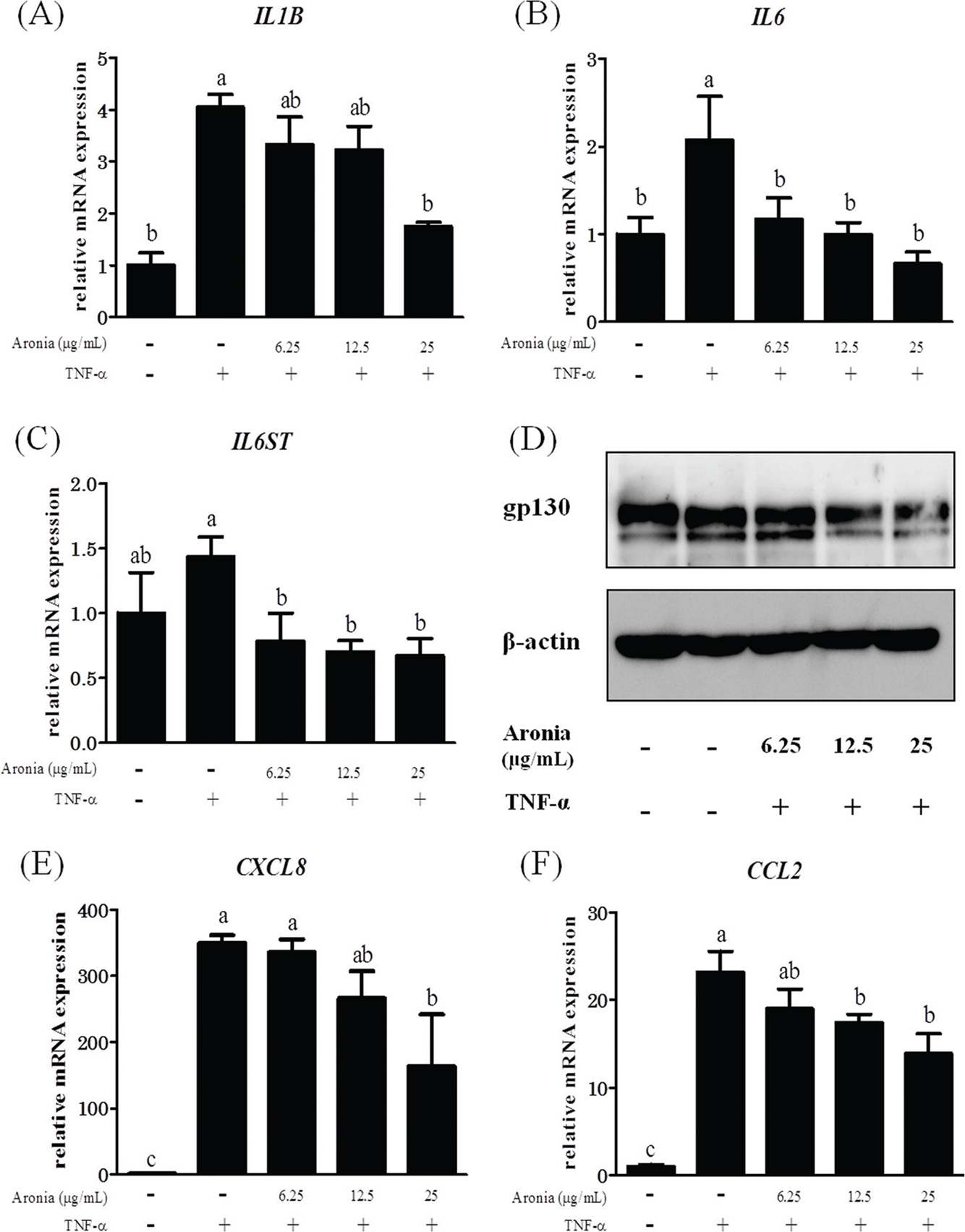 Fig. 1. Effects of aronia berry extract on inflammation-related factors. HUVECs were pretreated with extract (0–25 μg/mL) for 24 h and then stimulated with or without TNF-α (10 ng/mL) for 3 h. The mRNA expressions for IL1B (A), IL6 (B), IL6ST (gp130) (C), CXCL8 (IL-8) (E), and CCL2 (MCP-1) (F) were measured by real-time RT-PCR. Values are mean ± SD (n = 3). Different letters indicate a significant difference between groups (Tukey’s test after one-way ANOVA, p < 0.05). (D) The gp130 protein expression was analyzed by western blotting. Representative blots are shown.