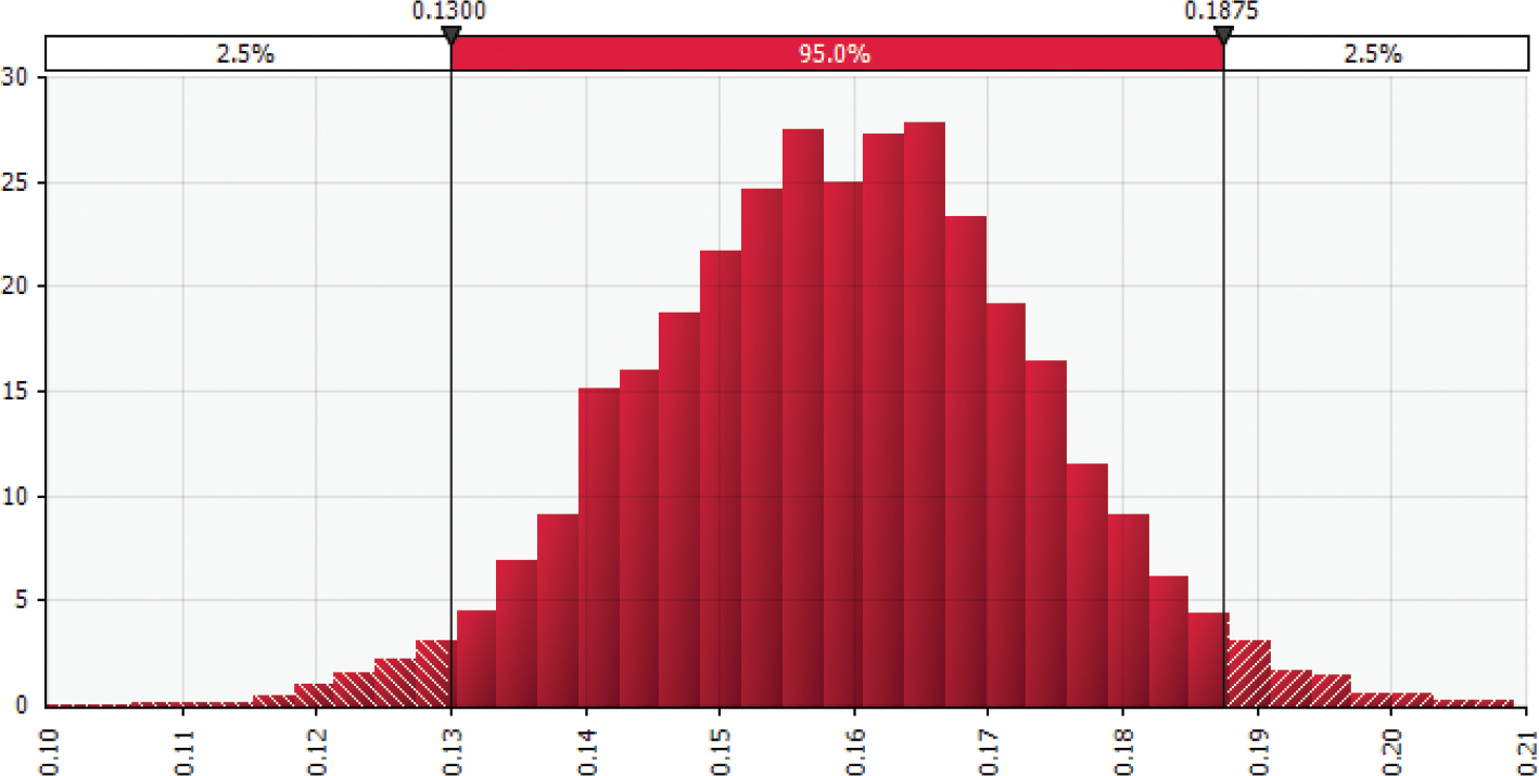 Fig. 3. Distribution of Monte Carlo simulation results for the Canadian healthcare cost savings given a 20% increase in adherence to Mediterranean-style diet, in year 2017 Can$ billion. Illustrates the distribution of 10,000 Monte Carlo simulation results for estimated cost savings from adopting MedDiet in Canada (measured in year 2017 Can$ billion). These include direct cost savings, for example, from fewer prescribed medications and hospital stays, and indirect cost savings, for example, from lost productivity and mortality. We found 95% of simulation results fell between Can$0.29 and $0.34 billion. Results generated by using the @RISK software for Microsoft Excel.