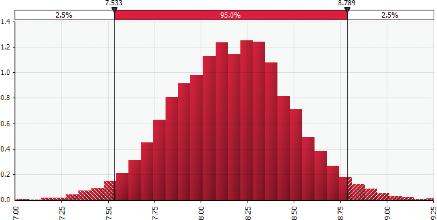 Fig. 2. Distribution of Monte Carlo simulation results for the American healthcare cost savings given a 20% increase in adherence to Mediterranean-style diet, in year 2017 US$ billion. Illustrates the distribution of 10,000 Monte Carlo simulation results for estimated cost savings from adherence to Mediterranean-style diet (MedDiet) in the United States (measured in year 2017 US$ billion). These include direct cost savings, for example, from fewer prescribed medications and hospital stays, and indirect cost savings, for example, from lost productivity and mortality. We found 95% of simulation results fell between US$7.5 and $8.9 billion. Results generated by using the @RISK software for Microsoft Excel.