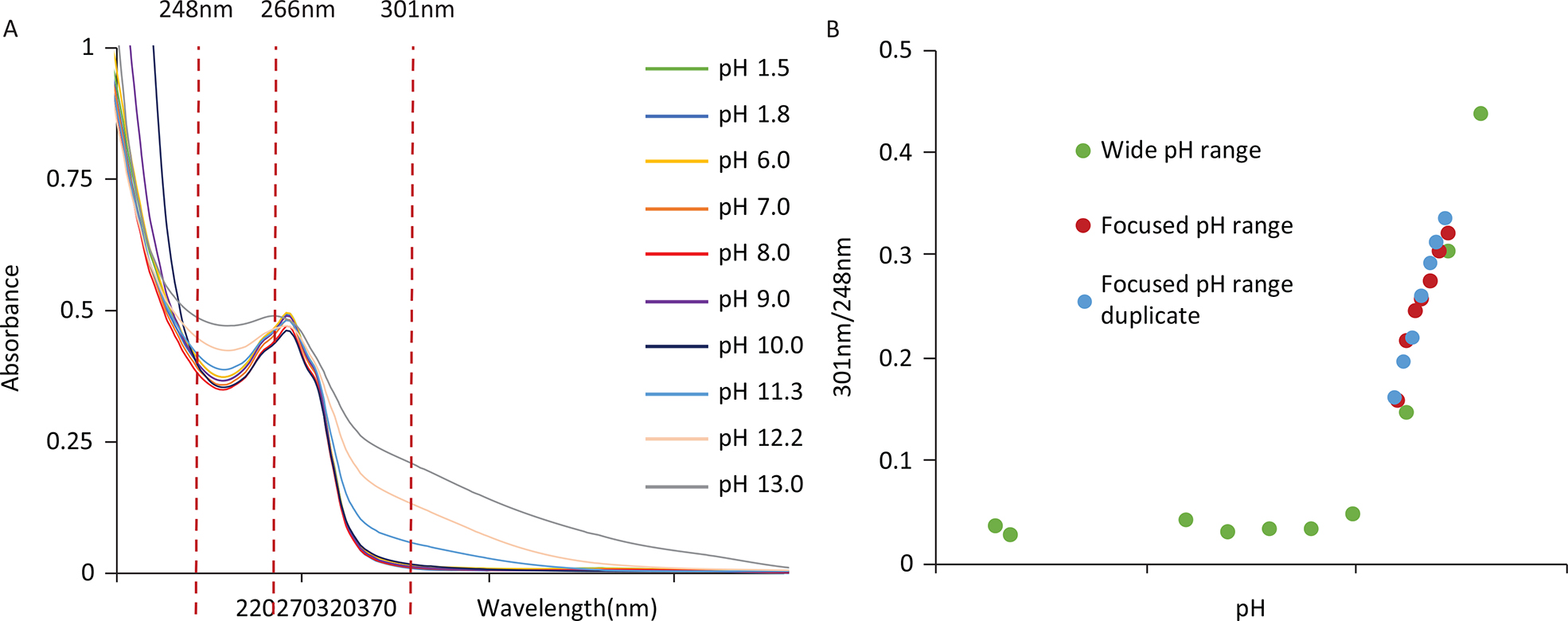 Fig. 2. (A) UV spectra of NR at varying pH conditions from pH 1.5 to pH 13. (B) 301 nm/248 nm absorbance against pH for NRCl with preliminary wide pH range (green) to inform for focused experiments (red and blue) to determine pKa values. pKa values of 11.5 ± 0.2 and 11.5 ± 0.1 were obtained from the focused pH range and focused pH duplicate respectively.