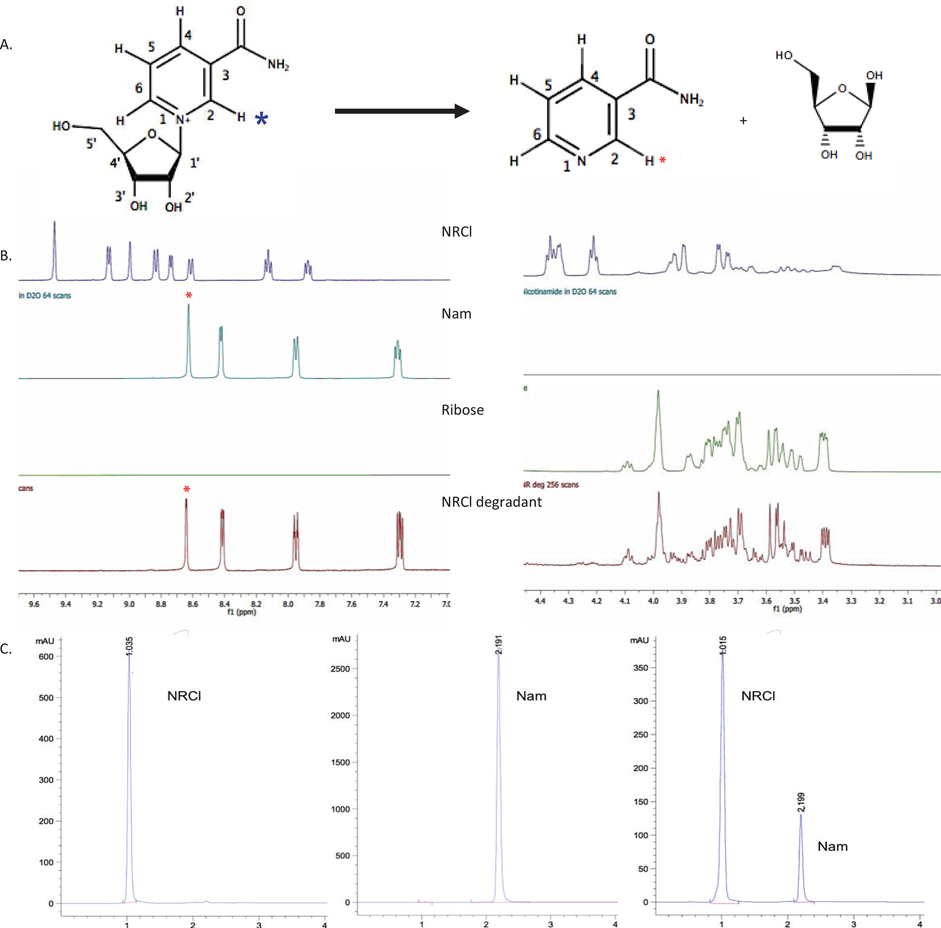 Fig. 3. (A) The proposed scheme for degradation of NR to nicotinamide and sugar under basic conditions. (B) Proton NMR spectra of (from top to bottom) NR, Nam, D(-)-ribose, and degraded NR after forced degradation with stars representing the H2 proton on NR and Nam, respectively. (C) HPLC chromatogram using UV detection at 266 nm showing (left) NR with a retention time of 1.015 min, (middle) the reference Nam with a retention time at 2.199 min, and partially degraded NR showing a mixture of NR and Nam.