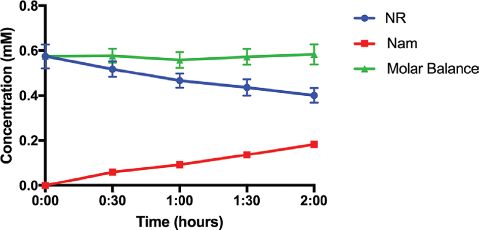 A forced degradation study was performed by subjecting the NR-deuterated water solution to an elevated temperature condition (75°C) for prolonged periods of time. Samples were taken every 4–6 h and analysed using proton NMR to confirm the status of the degradation process. As NR degrades, nicotinamide and sugar are formed. Figure 3A illustrates the proposed mechanism of NR degradation by base catalysed hydrolysis. Figure 3B shows the proton NMR spectra for NR, Nam, D(-)-ribose, and degraded NR. It can be seen that as the NR peak decreases in intensity, the Nam peak proportionally increases (Fig. 3B, left). It is also evident (Fig. 3B, right) that proton peaks identical to those of the reference ribose were present in the degraded NR product, confirming formation of ribose upon NR degradation. The HPLC chromatograms in Fig. 3C depict the elution of NR and Nam, respectively, from their own standard solutions and, from a sample that contains partially degraded NR. Figure 4 shows the concentration change of NR and Nam over time (quantification by HPLC assay), respectively, compared to the molar balance (NR plus Nam). As NR degrades and decreases in concentration, the concentration of Nam proportionally increases and the molar balance (the sum of both NR and Nam) remains consistent at approximately 0.57 mM.
