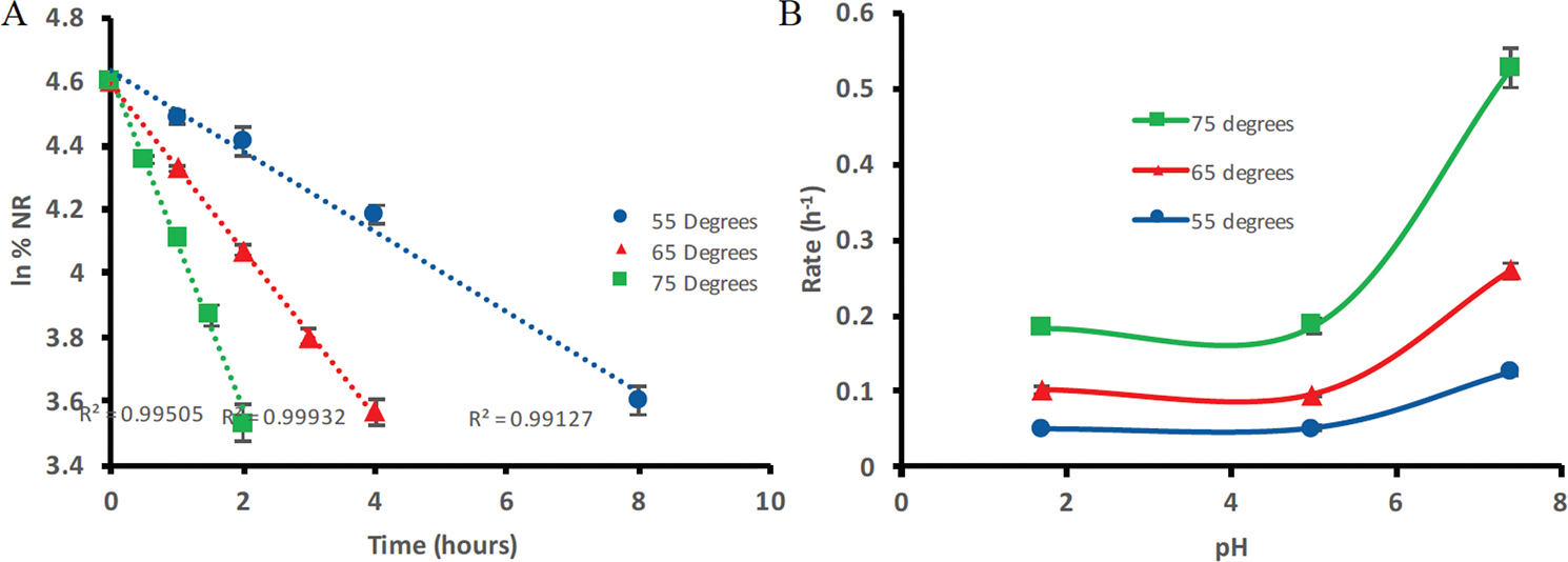 Good linearity was seen for all pH and temperature environments tested when the natural log of the percentage NRCl remaining was plotted against time with all R2 values >0.99. From these plots, the average rates were determined (n = 5).