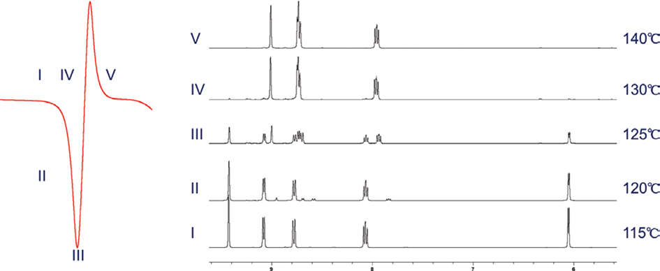 Fig. 7. (A) Melting motif of NRCl. I – 115, II– 120, III – 125, IV – 130, and V –140°C. NR shows complete degradation at 130°C on heating. (B) 1H NMR spectra from 9.5 to 5.5 ppm of NRCl that was heated to respective temperature then quenched to −40°C. NRCl was completely intact under condition I but was completely degraded under condition IV with increasing levels of degradation seen in conditions II and III.
