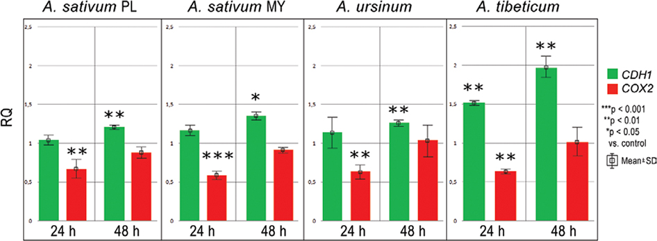 Fig 1. Chart bar illustrating the results of CDH1 and COX2 mRNA expression in MKN74 cell line treated with Allium sativum PL (Poland), Allium sativum MY (Malaysia), Allium ursinum and Allium tibeticum after 24 and 48 h. Data are presented as the mean RQ ± SD. The statistical significance of differences between control and treated cultured was presented as *P ≤ 0.05, **P ≤ 0.01, ***P ≤ 0.001.
