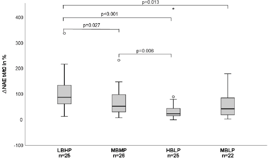As shown in Table 4, there was a significant reduction of blood pH within LBHP (P = 0.003) and MBMP (P = 0.006) between baseline and t4, whereas no significant change was noted for HBLP and MBLP. With regards to HCO3−, for MBLP, a significant increase was detected (P = 0.001) whereas for HBLP significance was marginally missed (P = 0.057). Moreover, with MBLP, pCO2 (P = 0.002) and BE (P = 0.003) increased, while pO2 (P = 0.007) decreased significantly in this group as well. The intergroup comparison revealed a significant difference among the groups regarding the blood pH at t4 (P = 0.041).