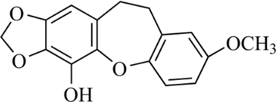 The purified compound was a white-like powder, EI-MS m/z 286[M]+; 1H NMR (600 MHz, CD3OD) δ: 6.29 (1H, s, H-1), 6.92 (1H, d, J = 8.4 Hz, H-5), 6.53 (1H, dd, J = 3.0, 8.4 Hz, H-6), 6.54 (1H, d, J = 3.0 Hz, H-8), 2.97 (4H, s, H-9, 10), 5.93 (2H, s, H-11), 3.79 (3H, s, OCH3); 13C NMR (150 MHz, CD3OD) δ: 109.1 (C-1), 140.2 (C-2), 135.7 (C-3), 154.7 (C-4), 127.9 (C-4a), 140.9 (C-4b), 122.3 (C-5), 114.5 (C-6), 151.1 (C-7), 117.4 (C-8), 133.7 (C-8a), 31.8 (C-9), 31.3 (C-10), 137.1 (C-10a), 102.8 (C-11), 57.2 (OCH3). The above spectra data were basically in agreement with literature (6). Therefore, it was identified as pholidonone (Fig. 1), which is a rare stilbene derivative with a seven-membered oxygen-containing ring and a methylenedioxy functionality.