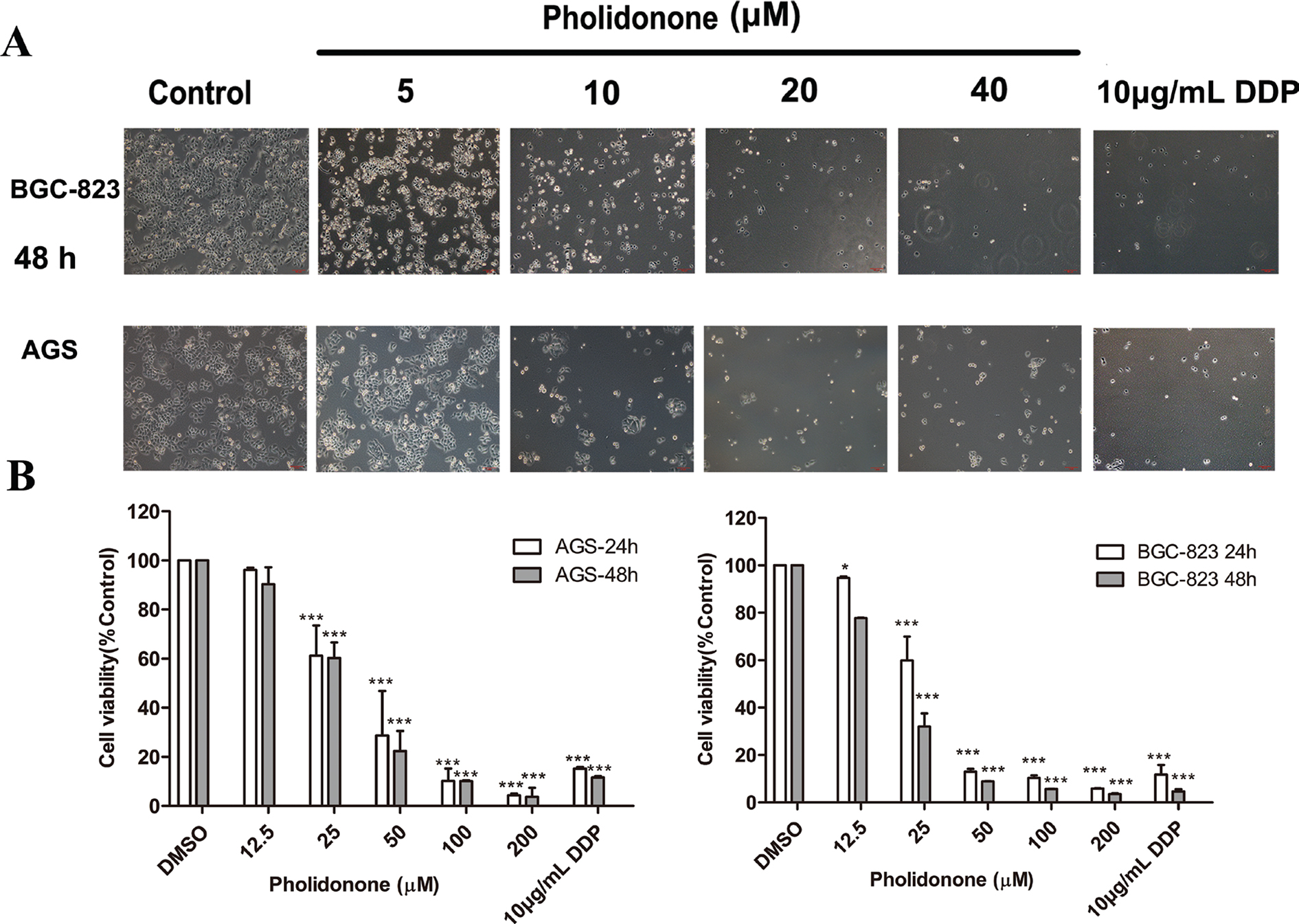 Fig. 2. The inhibitory effect of pholidonone on AGS and BGC-823 cells viability. Morphological change of AGS and BGC-823 cells after incubation with pholidonone (0, 5, 10, 20, and 40 μM) for 48 h (magnification × 100) (A). The effect of pholidonone on the cell viability of AGS and BGC-823 cells (B). AGS and BGC-823 cells were treated with pholidonone (0, 12.5, 25, 50, 100, and 200 μM) for 24 and 48 h, respectively, and DDP at 10 μg/mL was used as a positive control. Data are presented as means ± SD by three independent experiments. Statistical significance: *p < 0.05, ***p < 0.001, compared with control (DMSO).