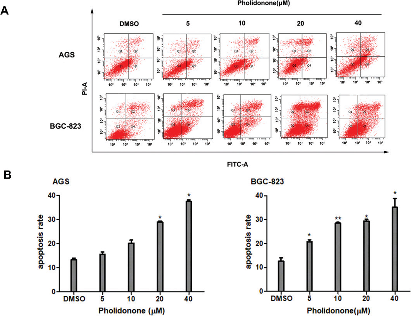 Fig. 3. Pholidonone induces apoptosis in AGS and BGC-823 cells. Flow cytometric analyses of annexin V-FITC/PI double-staining in AGS and BGC-823 cells treated with pholidonone (0, 5, 10, 20, and 40 μM) for 48 h (A). The percentage of apoptotic cells in AGS and BGC-823 cells treated with pholidonone (0, 5, 10, 20, and 40 μM) for 48 h (B). Data are presented as means ± SD by three independent experiments. Statistical significance: *p < 0.05, **p < 0.01, compared with control (DMSO).