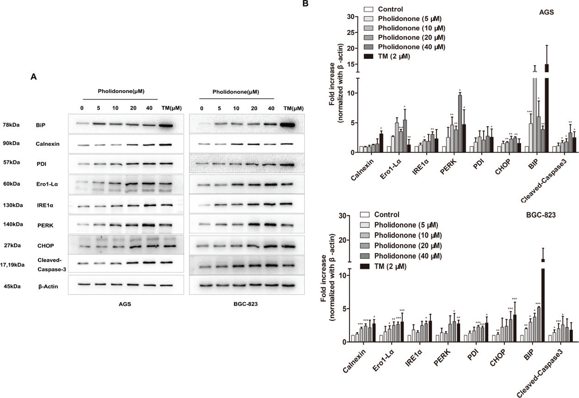 Fig. 4. Pholidonone activates ER stress-related signals in AGS and BGC-823 cells. Protein expression levels of BiP, Calnexin, PDI, Ero1-Lα, IRE1α, PERK, CHOP, and Cleaved-caspase-3 in AGS and BGC-823 cells treated with 0, 5, 10, 20, and 40 μM pholidonone for 48 h, with β-actin as the control (A). Densitometry analysis of the protein levels of apoptosis-related proteins in AGS and BGC-823 cells treated with pholidonone (B). Data are presented as means ± SD by three independent experiments. Statistical significance: *p < 0.05, **p < 0.01,***p < 0.001, compared with control (DMSO).