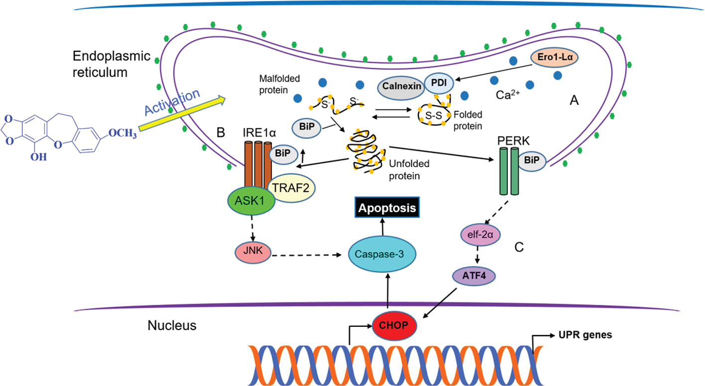 Fig. 5. Proposed mechanisms of the pro-apoptotic effect on human GC AGS and BGC-823 cells induced by pholidonone. Increasing expression of Ero1-Lα, PDI, and calnexin was observed, suggesting that malfolded proteins were accumulated in the ER after pholidonone administration, causing ER stress and provoking the unfolded protein response to activate the signaling cascade that triggers apoptosis (A); Pholidonone might trigger cell apoptosis through upregulating IRE1α and subsequently activating Caspase-3 signaling via JNK (B); Pholidonone might exert its pro-apoptotic effect through the activation of CHOP via PERK signaling pathway, which subsequently leads to the upregulation of Caspase-3, eventually triggering apoptosis (C).