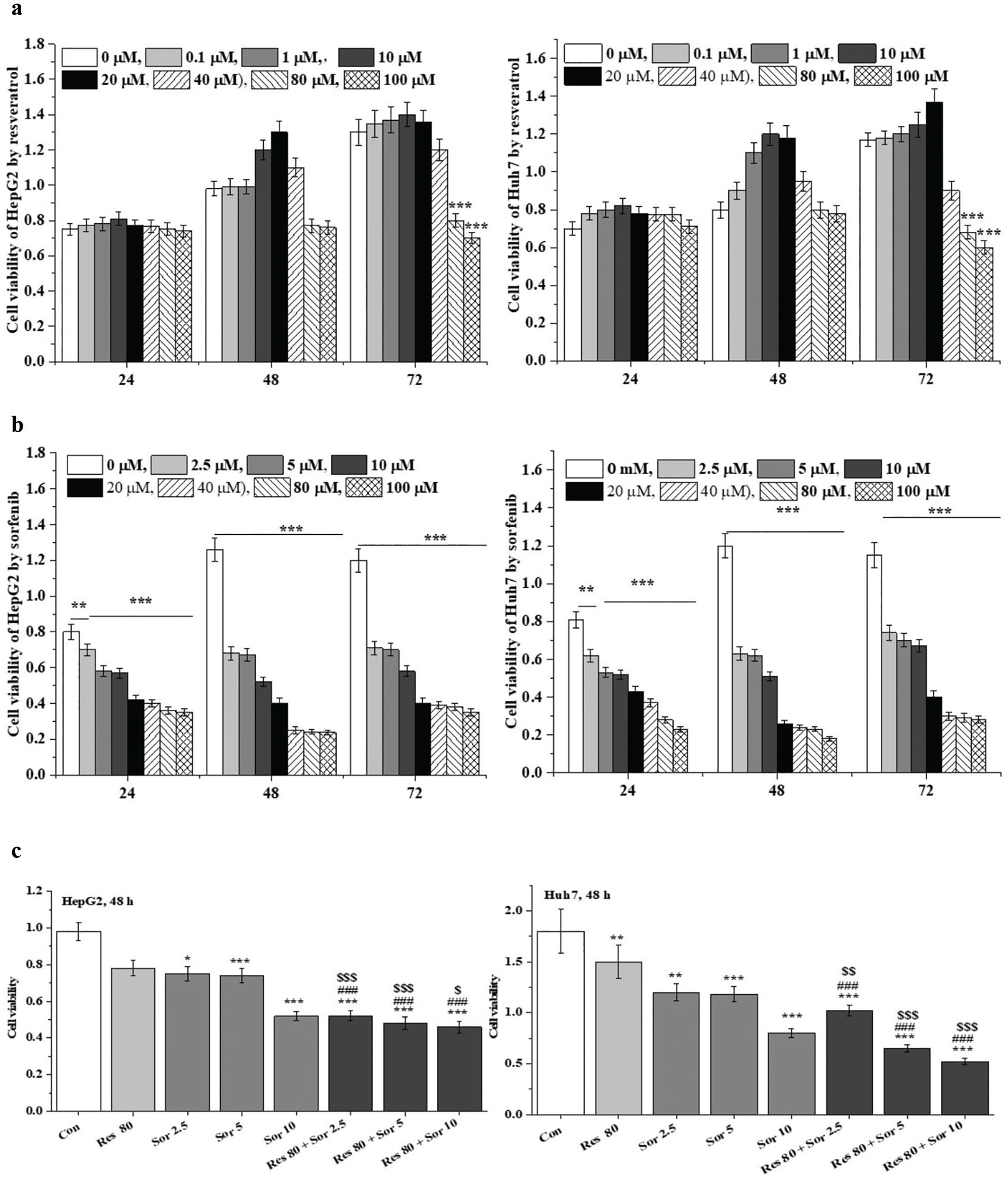 Fig. 1. Inhibitory effect of Res, Sor, and Res combination with Sor treatments on proliferation in HepG2 and Huh7 cells. The CCK-8 method was used to assay the cell proliferation, which expressed as cell viability. HepG2 (a) and Huh7 (b) cells were treated at 0–100 µM of Res and Sor alone for 24, 48, 72 h. (c) 80 µM Res combination 2.5–10 µM Sor combination treatment for 48 h in HepG2 and Huh7 cells. Data are expressed as mean ± SD (n = 3). *P < 0.05, **P < 0.01, and ***P < 0.001 versus the control group. ###P < 0.001 versus Res treatment group. $P < 0.05, $$P < 0.01, and $$$P < 0.001 versus the corresponding Sor treatment group.