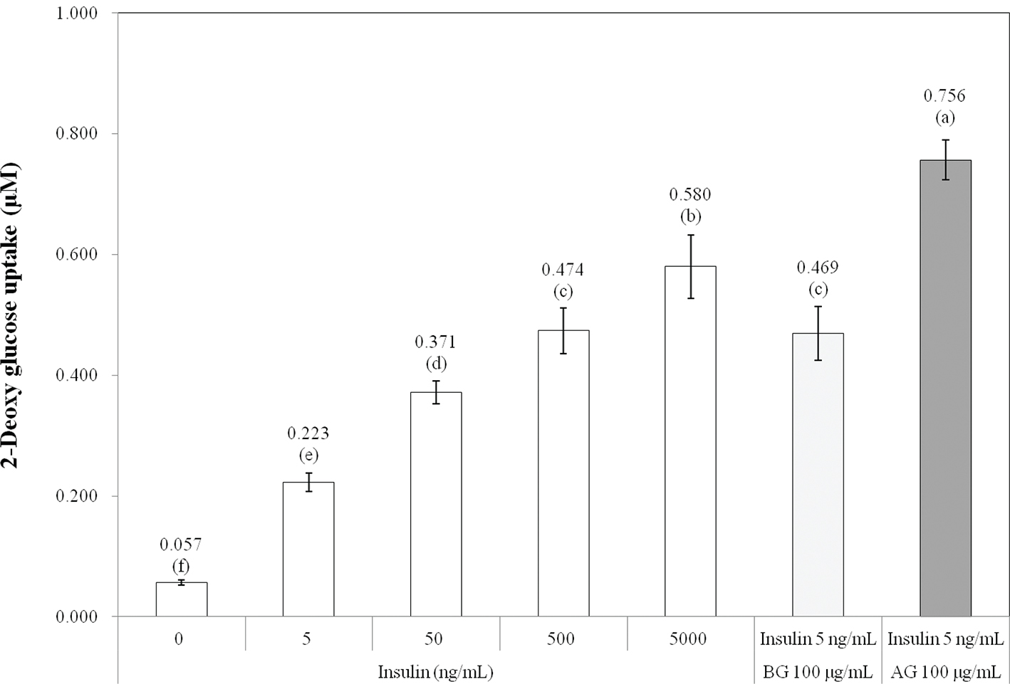 Fig. 1. Effects of insulin concentrations and rough rice extract before (BG) and after germination (AG) on glucose uptake by 3T3- L1 adipocytes. a–fSignificant differences by Duncan's multiple range test (P < 0.05).