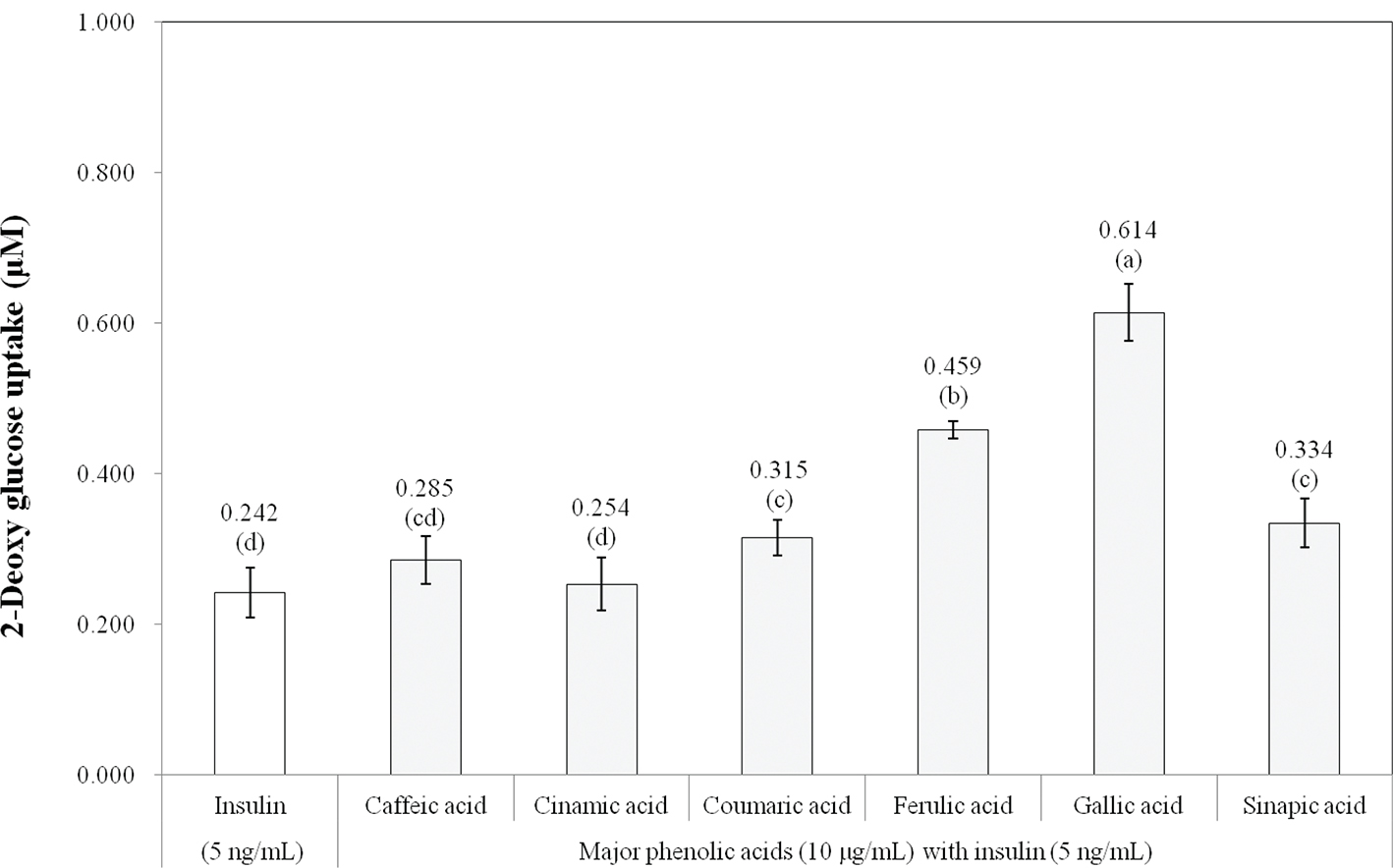 Fig. 2. Effects of major phenolic acids in germinated rough rice extract on glucose uptake by 3T3-L1 adipocytes. a–dSignificant differences by Duncan’s multiple range test (P < 0.05).