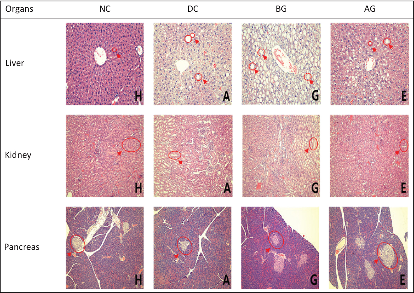 Fig. 3. Histological findings based on hematoxylin–eosin staining of liver, kidney, and pancreas in C57BLKS/J-db/db mice. Liver, kidney, and pancreas tissues were formalin-fixed and paraffin-embedded. Four-micron-thick tissue sections were prepared and stained with H&E (×200). H, NC (normal control); A, DC (diabetic control); G, before germinated rough rice extract (BG); E, after germinated rough rice extract (AG).