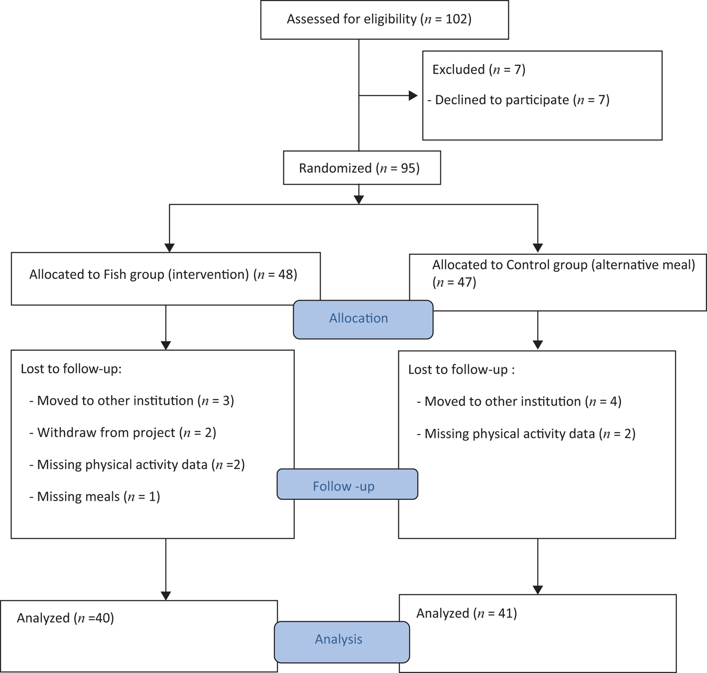 Before randomization of the participants into Fish group or the Control group, the participants were matched on age, IQ (Wechsler Adult Intelligence Scale-Fourth Edition (WAIS-IV) (23) and Psychopathy Checklist List-Revised (PCL-R) score (24). For randomization, a computerized random number generator (in Excel) was used to assign each of the matched pairs. The random allocations to the groups were completed after all participants were enrolled and had completed baseline testing (pre-test battery). To balance the intervention (fish) and control groups (alternative meal) on age, IQ and PCL-R scores, stratified randomization was used. Random allocation was not concealed as the random allocation was done simultaneously for all subjects rather than sequentially. In order to match the participants, one of the co-authors enrolled participants and another co-author produced the matched pairs (stratification). The same person who enrolled the participants set up the implementation of the computerized random number generator which determined the group to which each participant would be assigned (2, 14). Figure 1, a CONSORT diagram (Consolidated Standards of Reporting Trials), presents the study progress for this particular study. As shown in the figure, 102 individuals were assessed for eligibility, of whom 7 declined to participate. Thus, a total of 95 participants were randomized to either the Fish group or the Control group. Due to different reasons 10 participants were lost to follow-up post-test (see Fig. 1). Another four participants (two participants in each group) did not complete registration of physical activity. Based on the risk of introducing a bias when replacing missing data (25), missing data were not replaced.