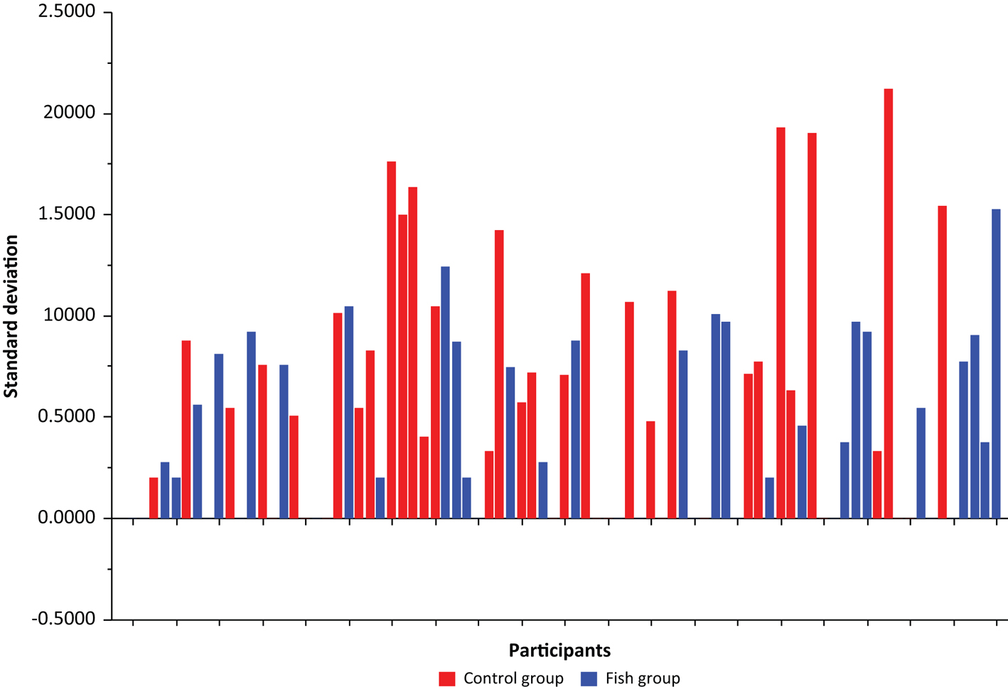 A closer look at the standard deviations for each individual’s training score over the test period, that is, a t-test of the two groups, indicates a difference bordering on significance t(79) = −1.99, P = 0.050 (Fish group: M = 0.47, SD = 0.44; Control group: M = 0.72, SD = 0.63; d = 0.47). The bar graph in Figure 2 displays the standard deviation of the weekly self-reported physical activity patterns. Red bars designate members of the Control group, and blue bars indicate the Fish group. Nearly all the larger standard deviations, including the six largest, belong to those in the Control group, indicating a more irregular physical activity pattern in this group. Fifty-seven participants had variations in their physical activity pattern, of which 27 were in the Fish group and 30 in the Control group. An interesting pattern emerged when studying the upper quartile of this subsample of 57 participants. No less than 12 of the 15 subjects in this quartile belong to the Control group, and only 3 belong to the Fish group. Two of the participants, one from each group, had the same standard deviation, so there were 15 and not 14 participants in the upper quartile. The Mann-Whitney U-test showed that these values differed significantly, and that the number of participants in the groups was significantly different (P = 0.012).