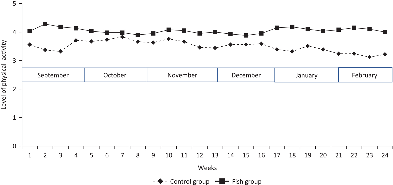 Results: The results revealed that the Fish group had a regular pattern of physical activity throughout the intervention period. The participants in the Control group showed a more irregular pattern of physical activity in addition to a significant reduction in physical activity over time.