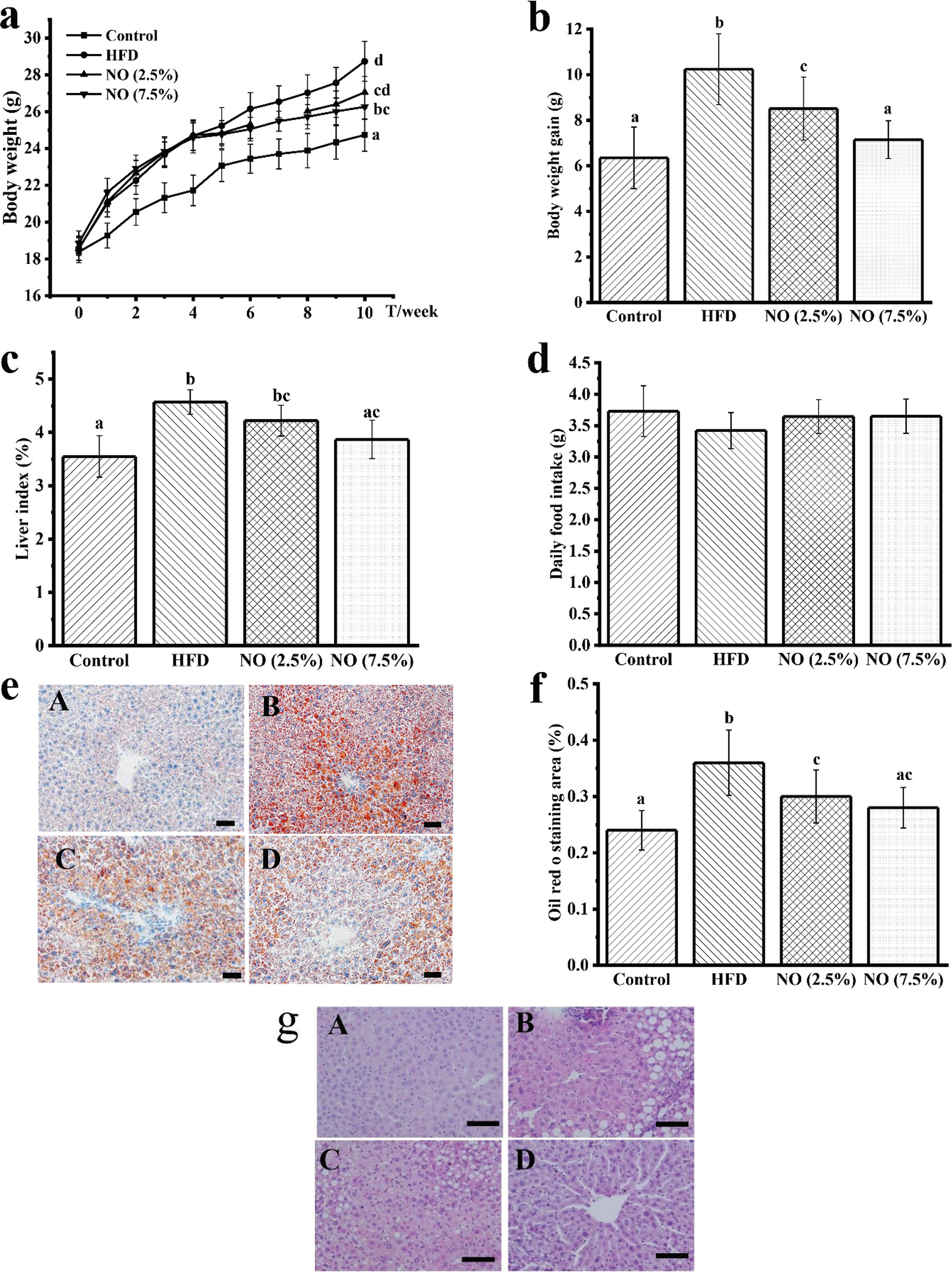 100%; (g) HE staining, 400×. Scale bar = 100 μm, A: Control, B: HFD, C: NO (2.5%), D: NO (7.5%). Bars marked with different letters represent statistically significant (P < 0.05), whereas bars labeled with the same letter indicate no statistically significant difference between the groups (P > 0.05). Values represent mean ± SEM; n = 10 in each group.
