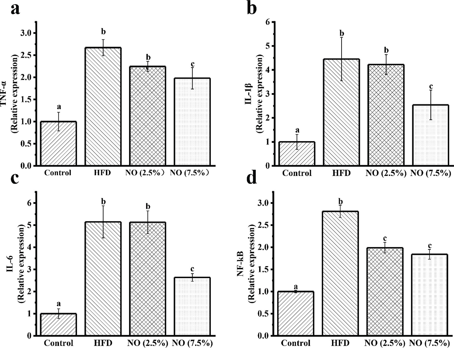 Design: At first, experimental animals received a high-fat diet (HFD) for 4 weeks, and then received a HFD supplemented with 2.5% or 7.5% NO for 6 weeks. In the current study, results show that treatment with NO decreases weight gain and liver index induced by HFD. In addition, the serum levels of TC, TG and LDL are significantly decreased in NO treatment groups.