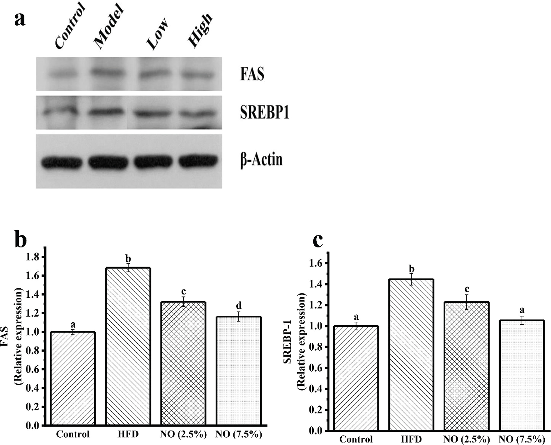 Fig. 3. Effects of NO on FAS and SREBP-1 protein expression in mice liver. Model: HFD, Low: NO (2.5%), High: NO (7.5%). Representative immunoblots for FAS and SREBP-1 proteins are shown in a. Relative expression levels normalized to internal control (β-Actin) are shown in b and c. Data represent the mean ± SEM, n = 6. Letters represent statistically significant differences (P < 0.05). Instances of the same letter between the groups indicate that no statistically significant difference was found between the groups (P > 0.05).