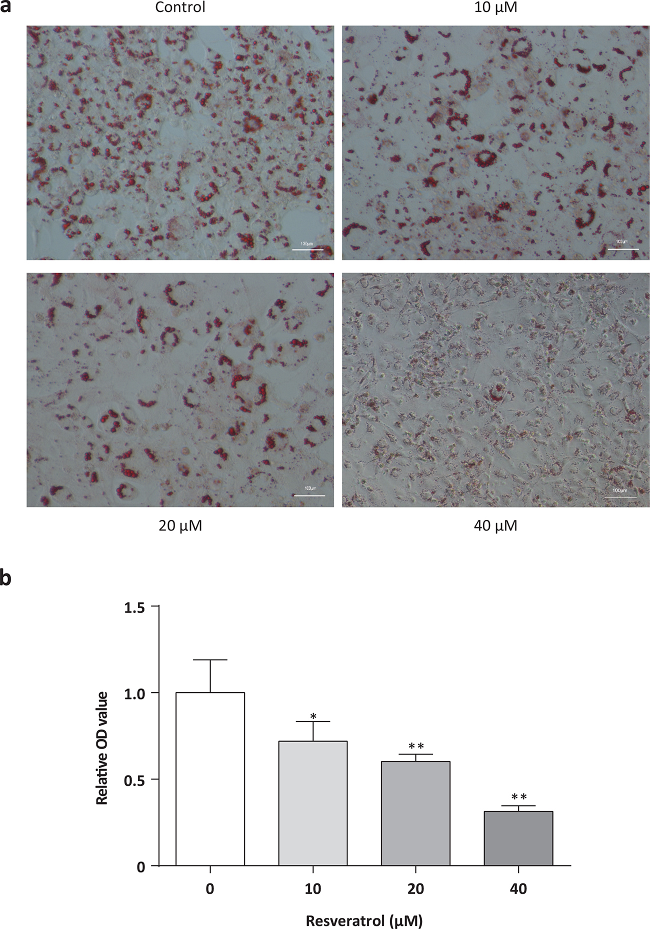 Fig. 3. Effects of resveratrol on lipid accumulation in 3T3-L1 adipocytes. Oil Red O staining of mature 3T3-L1 adipocytes captured at 200× magnifications (a) and relative optical density (OD) value determined at OD540 (b). Oil O Red images were from 3T3-L1 adipocytes treated with Res for 8 days. All data are presented as the mean ± standard deviation (SD), and differences between groups were determined by one-way analysis of variance (ANOVA) using the Statistical Package of Social Science (SPSS, version 20.0; SPSS Inc.) program, followed by Tukey’s post hoc tests. Statistical significance between control and Res-treated groups is shown as *P < 0.05 or **P < 0.01. The amount of DMSO was 0.08% in control.