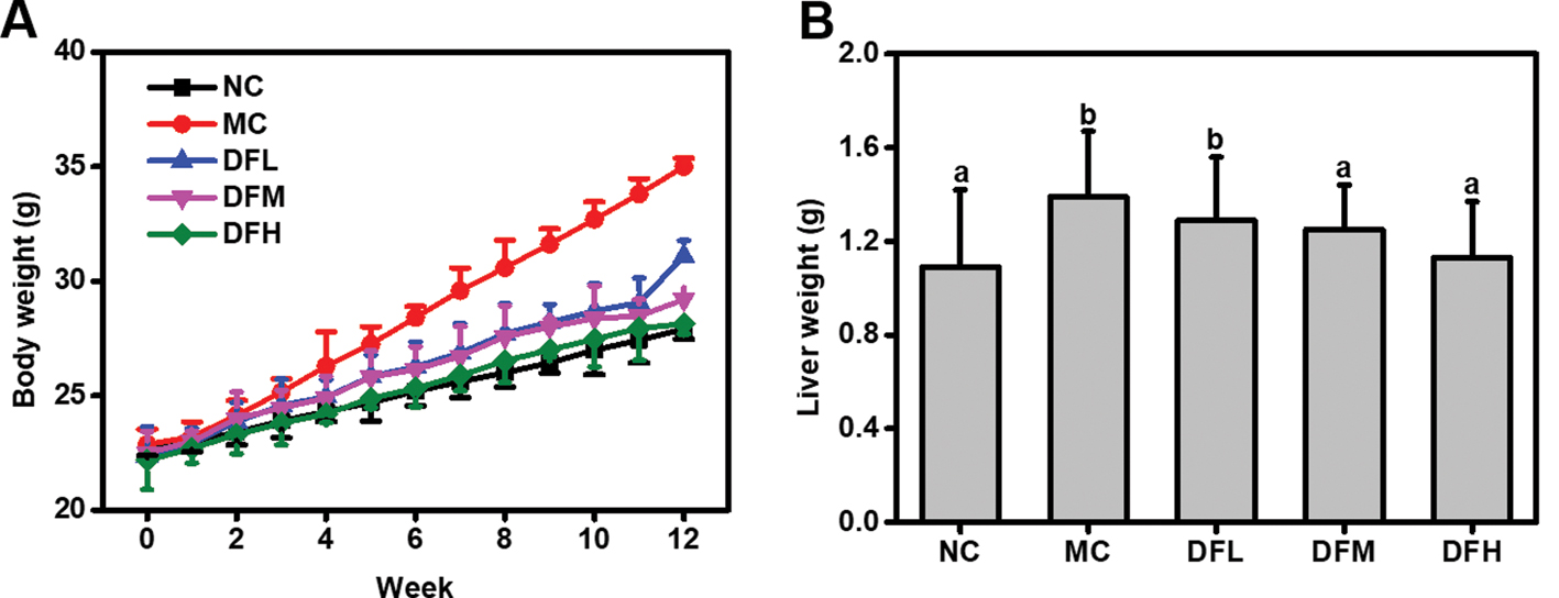 Fig. 1. Green tea leaf powder reduces the body weight (A) and liver weight (B) of HFD-fed mice. Values were measured in mice from NC, MC, DFL, DFM, and DFH groups (n = 7).